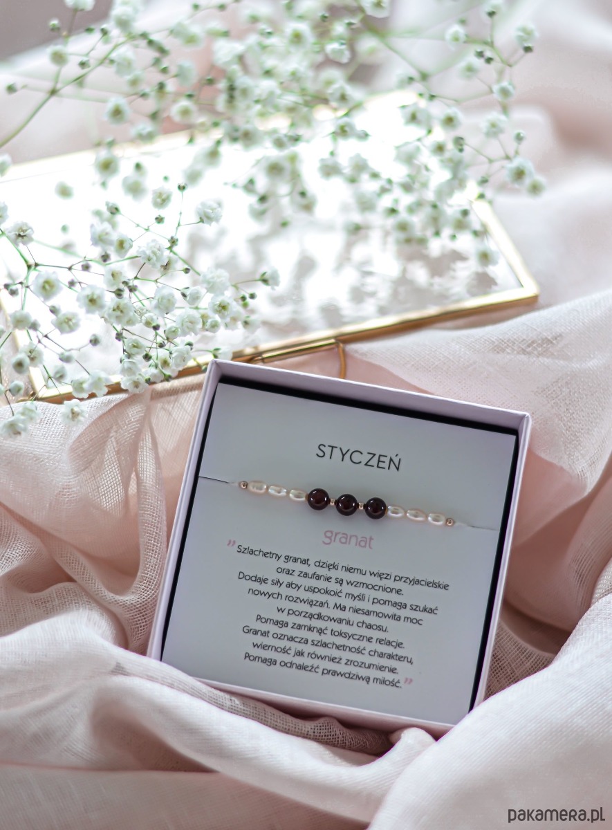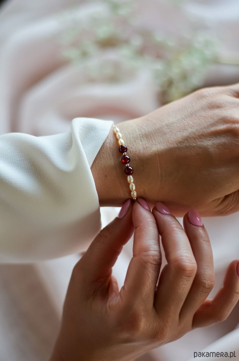 Bransoletka jest wykonany ręcznie z kamieni naturalnych: szlachetny granat, perły oraz srebra pokrytego 24k złotem. Bransoletka jest zapakowana w pudełko prezentowe.