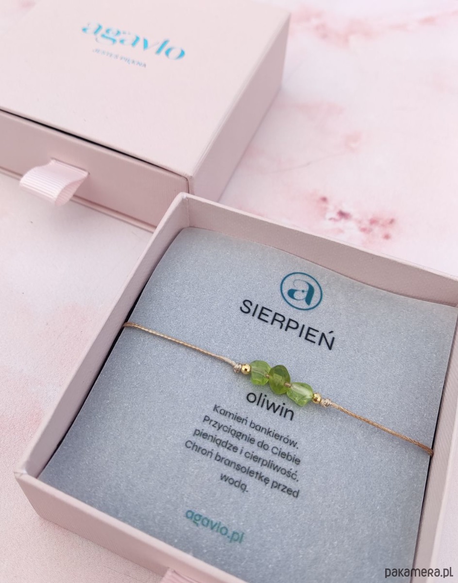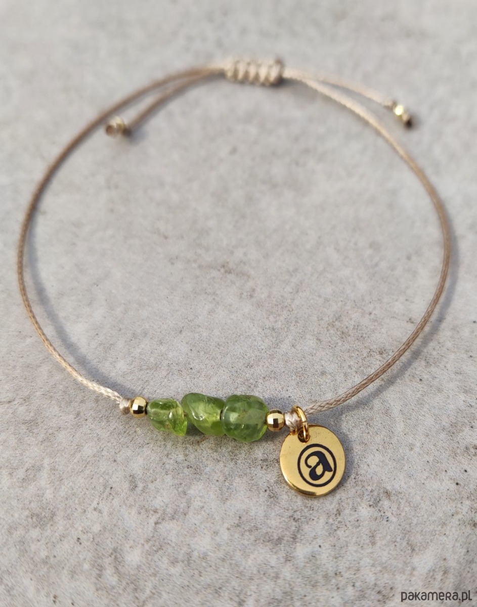 Bransoletka urodzeniowa z oliwinem wykończona pozłacanym srebrem.