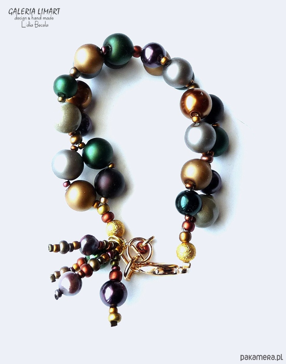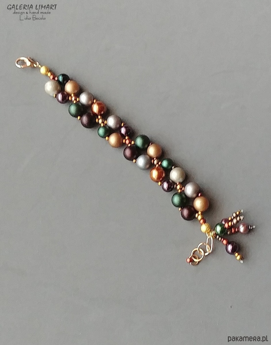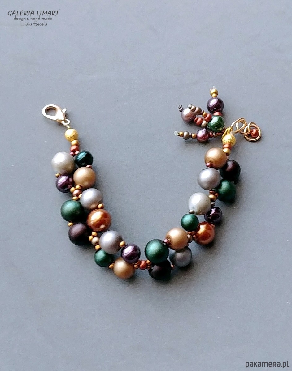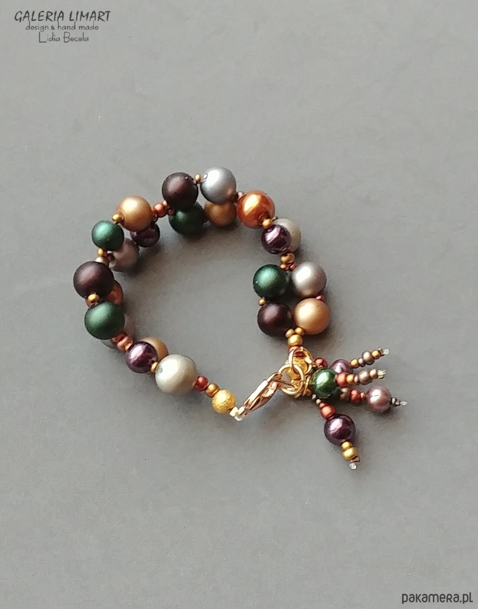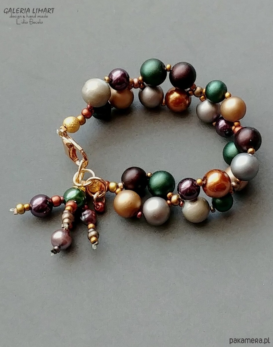 Kombinacja przeróżnych szklanych pereł w boskich odcieniach jesieni oraz miedzi, skomponowana w dwóch rzędach, dała niezwykle efektowny i spektakularny rezultat, tworząc bogatą bransoletkę w stylu dobrej starej biżuterii i modnego stylu boho.