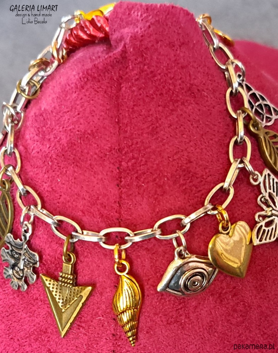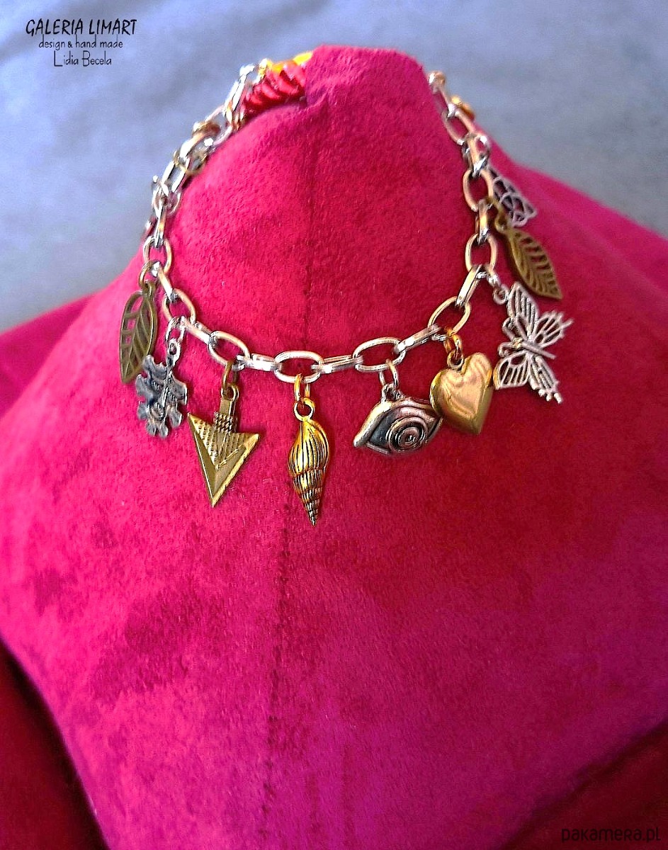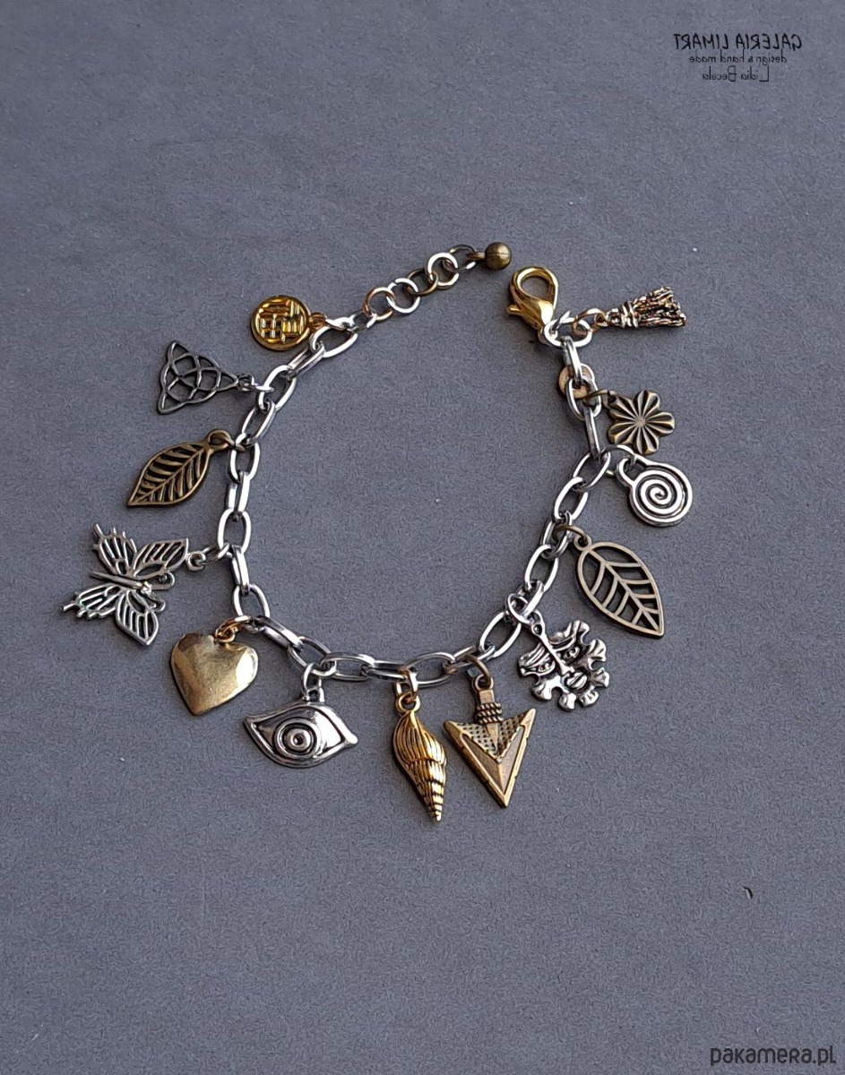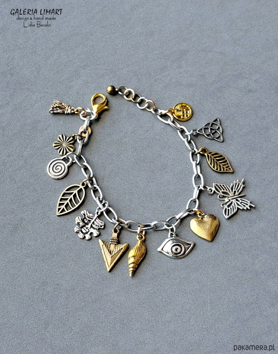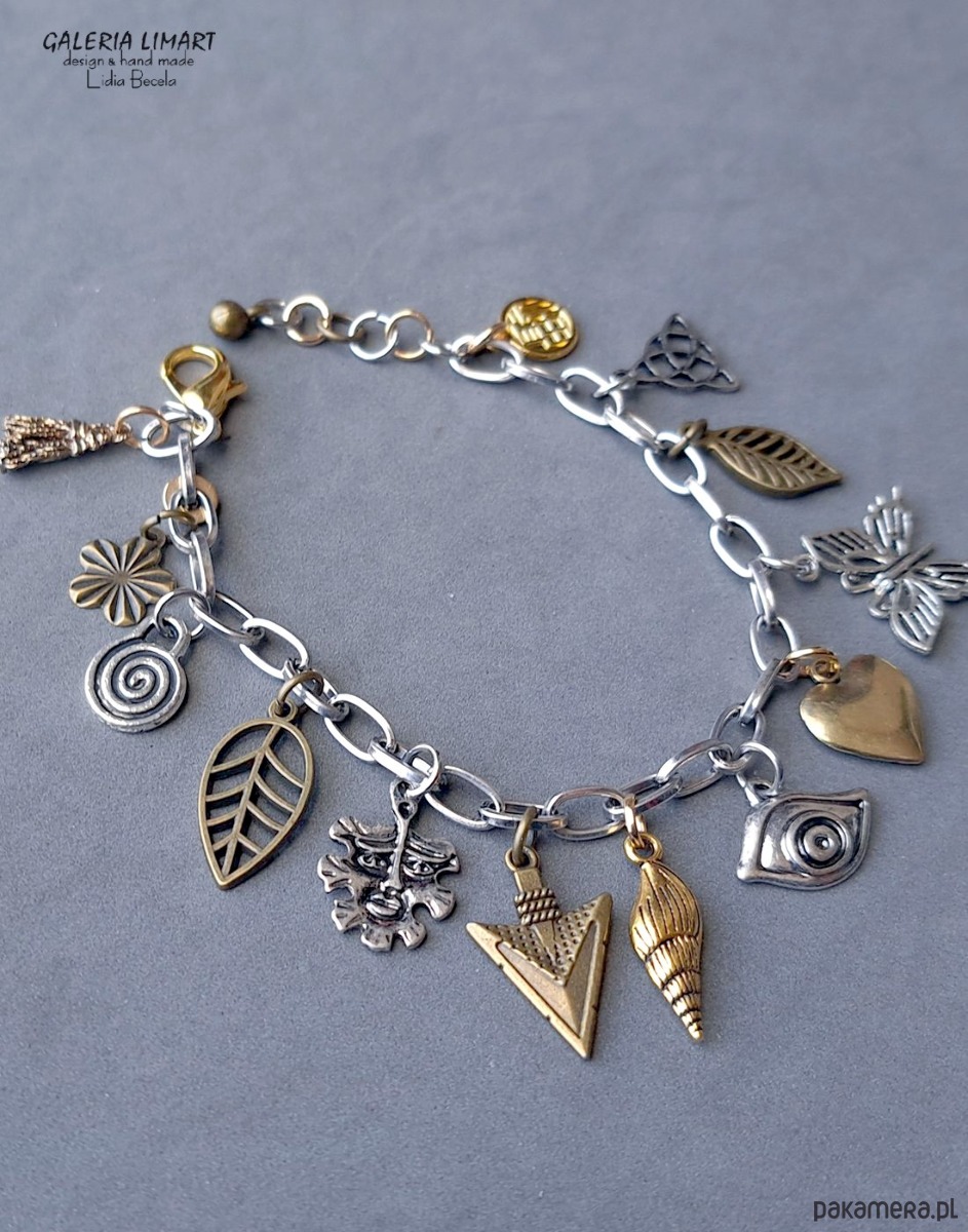 Połączenie przeróżnych ślicznych i zabawnych przywieszek z tzw. srebra tybetańskiego na przemian z mosiężnymi charms'ami w złotym kolorze, zostało zawieszone na stalowym łańcuszku, co dało uroczy i ciekawy efekt modnej bransoletki, dł. ok.17- 20 cm - w zależności od miejsca zapięcia.
