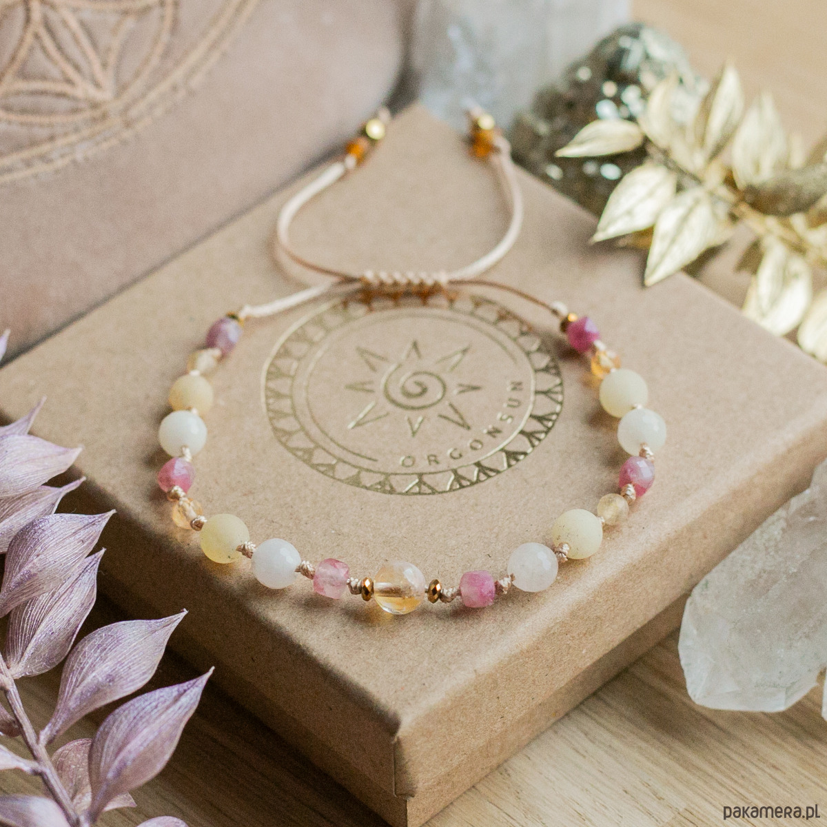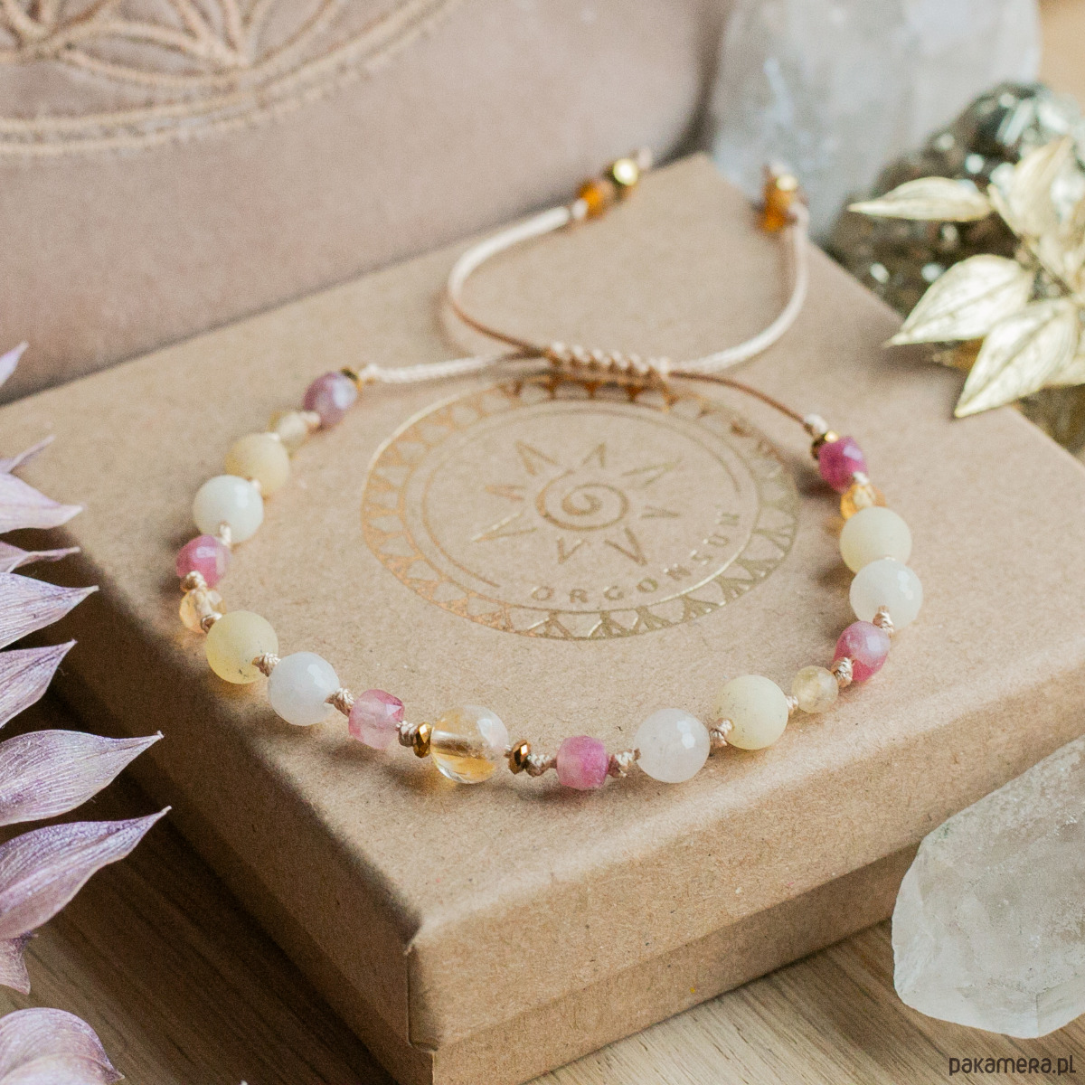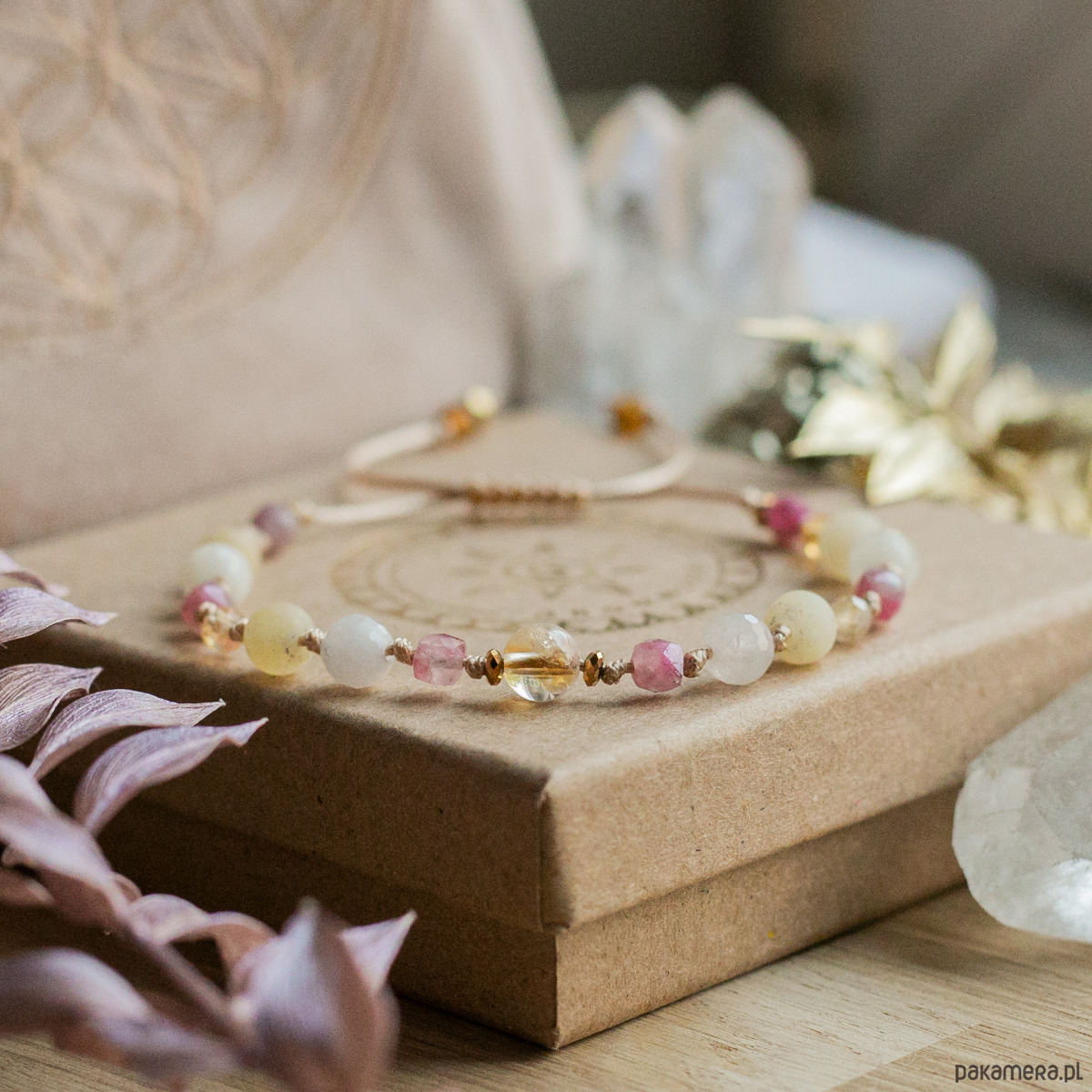 Zodiak Waga - Bransoletka wykonana z kamieni naturalnych: Cytryn, Turmalin Różowy, Kwarc Różowy i Jadeit. Tworzona z życzeniami dla nowej właścicielki: pomyślności, obfitości, radości życia i spełnienia marzeń.