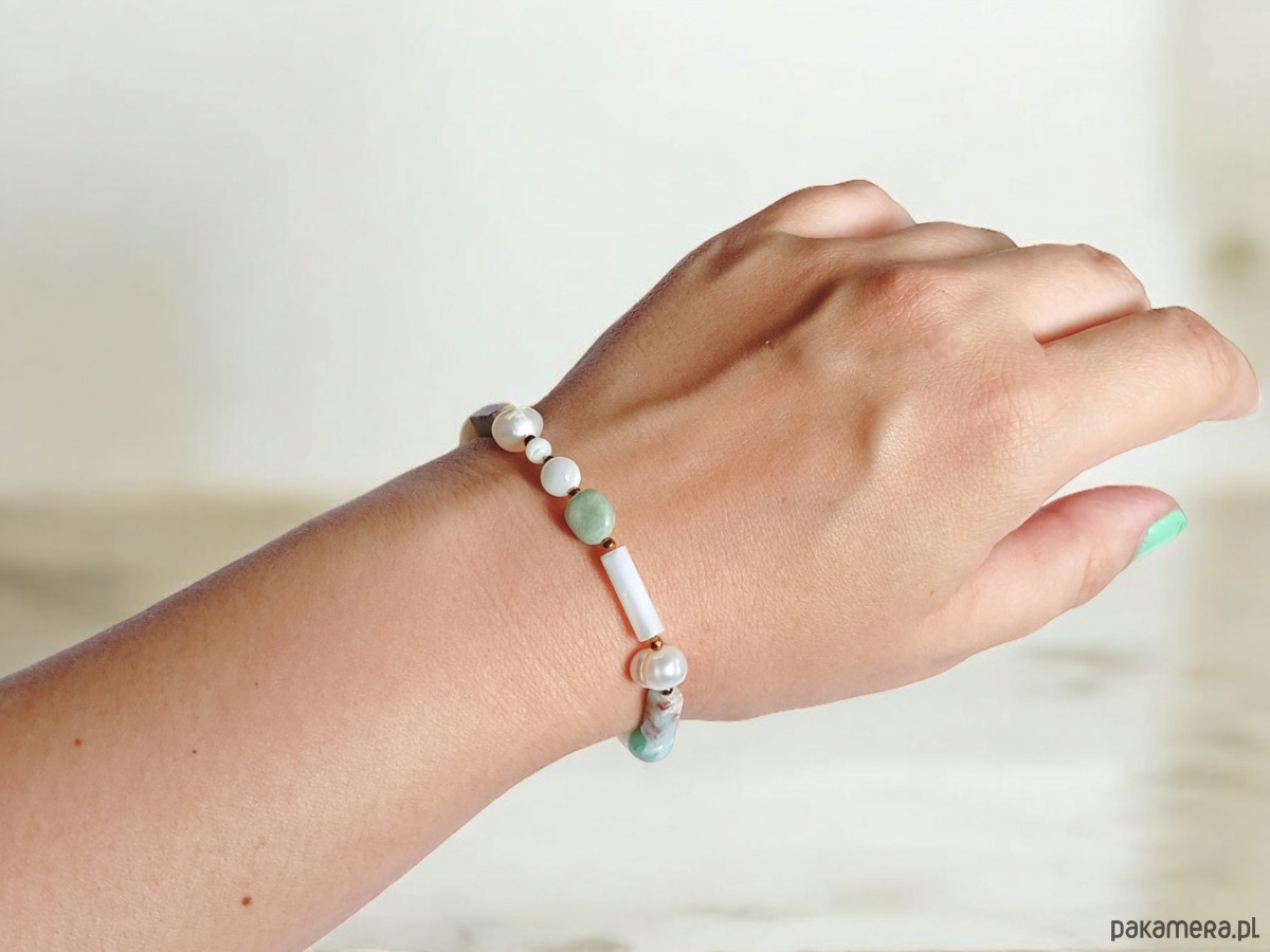 Bransoletka wakacyjna : perły , muszla, amazonit, jaspis cesarski :: light