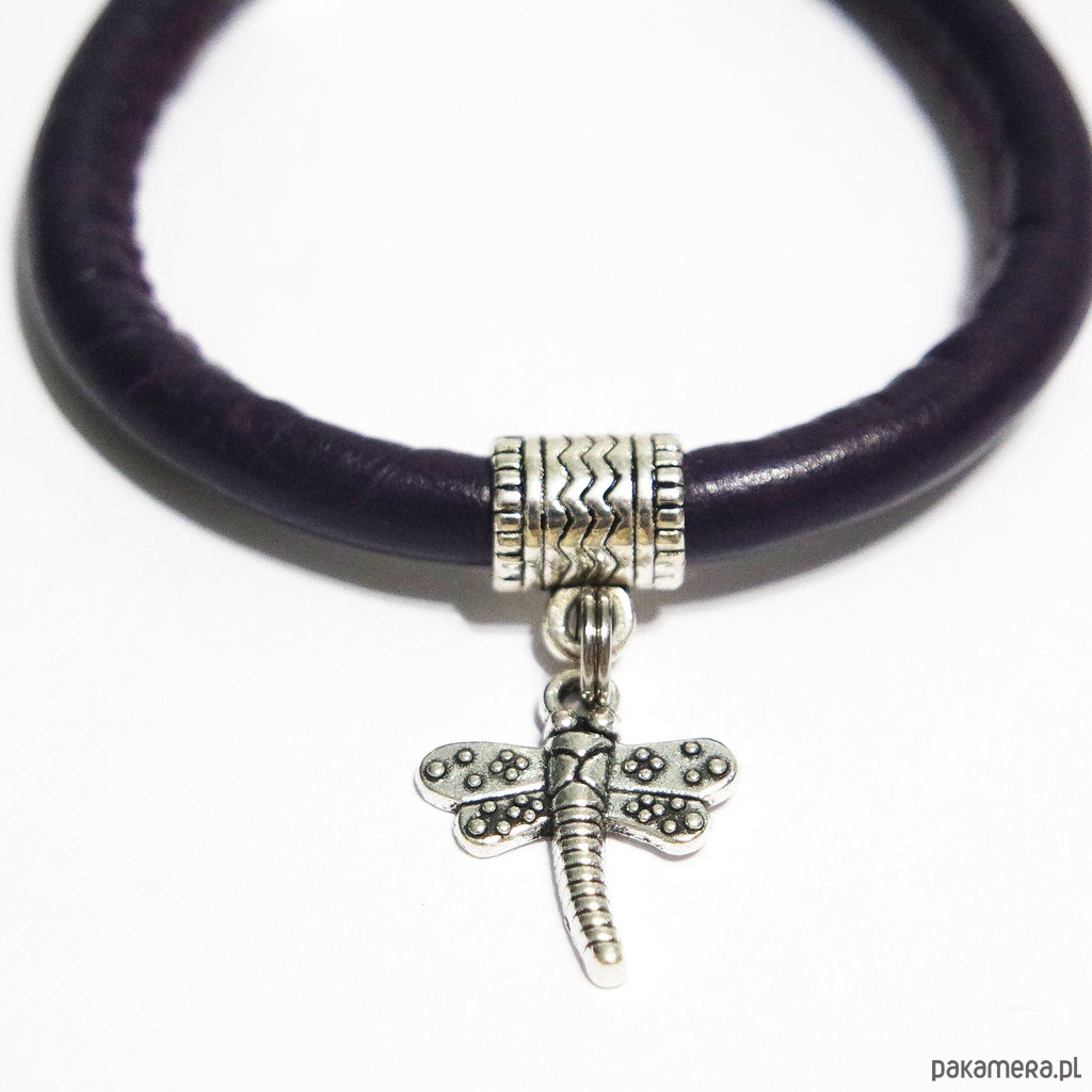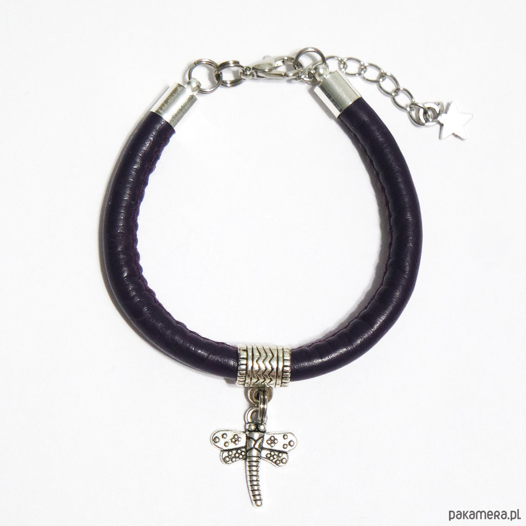 Bransoletka zrobiona jest z rzemienia z eko skóry w kolorze ciemnofioletowym/bakłażan i metalowej przekładki z ważką.