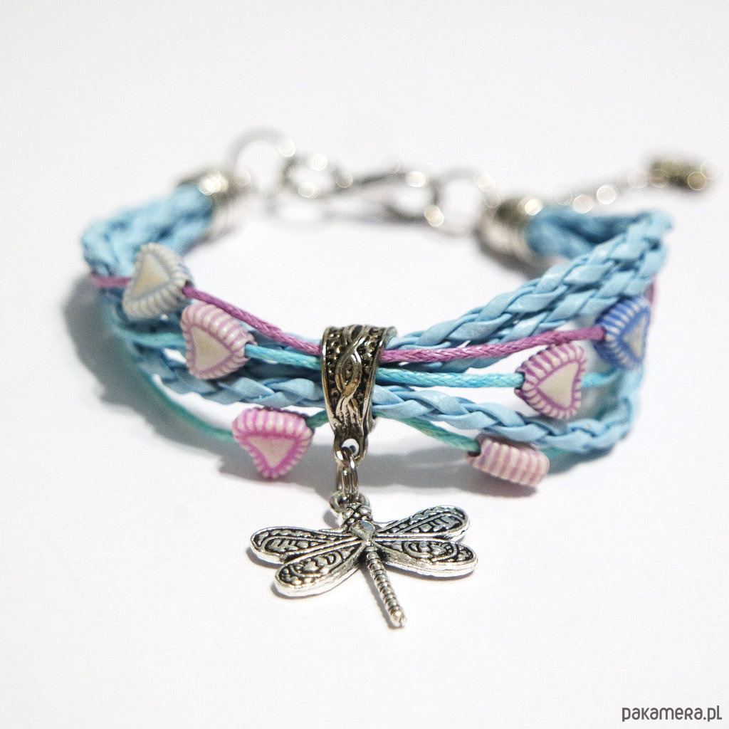 Bransoletka - Ważka, serce, niebieska - rzemienie
