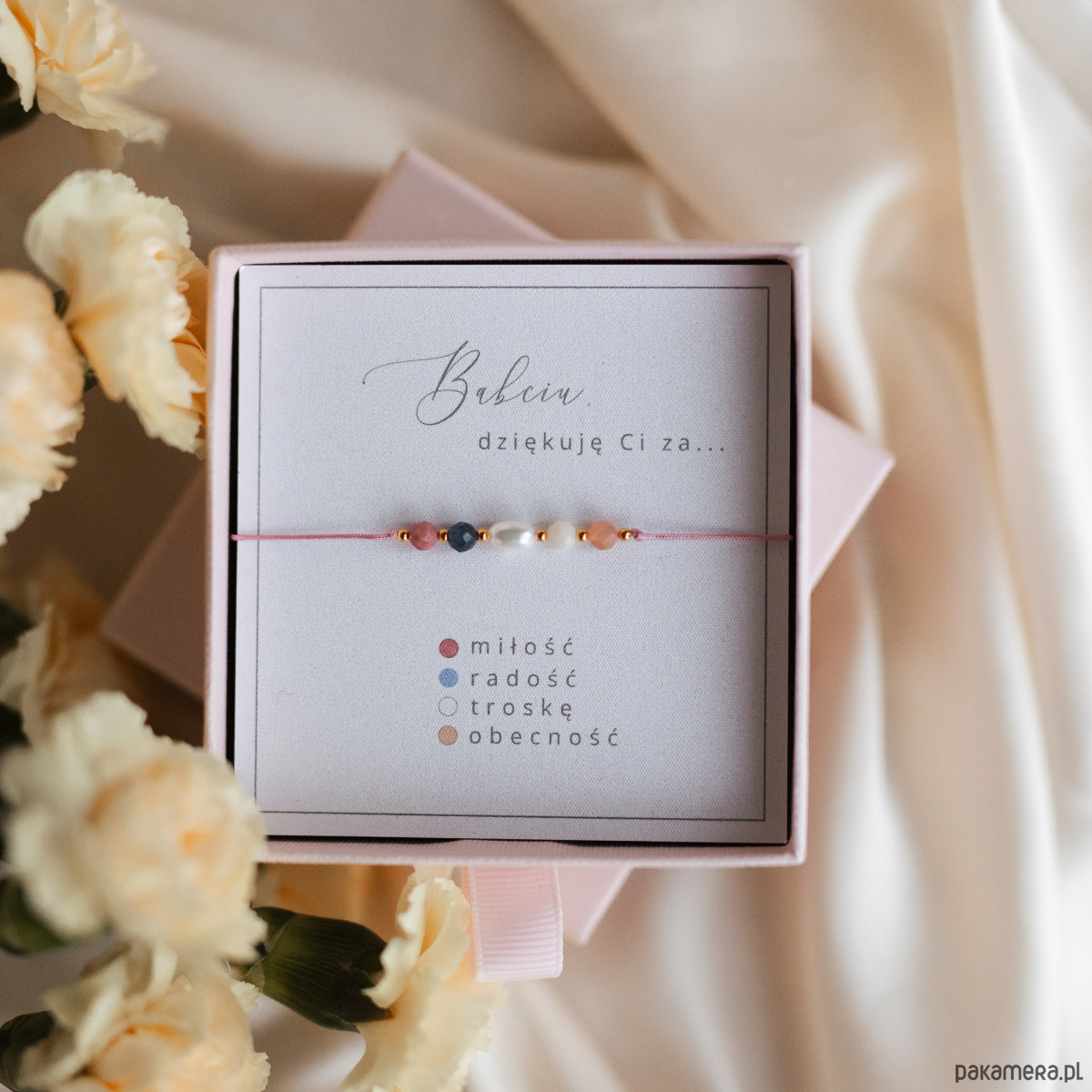 Bransoletka wdzięczności wykonana z naturalnych kamieni oraz perełki wraz z dołączoną dedykacją tworzy wyjątkowy prezent. Każdy kamień ma swoją symbolikę, każdy odzwierciedla to, za co chcielibyśmy podziękować.