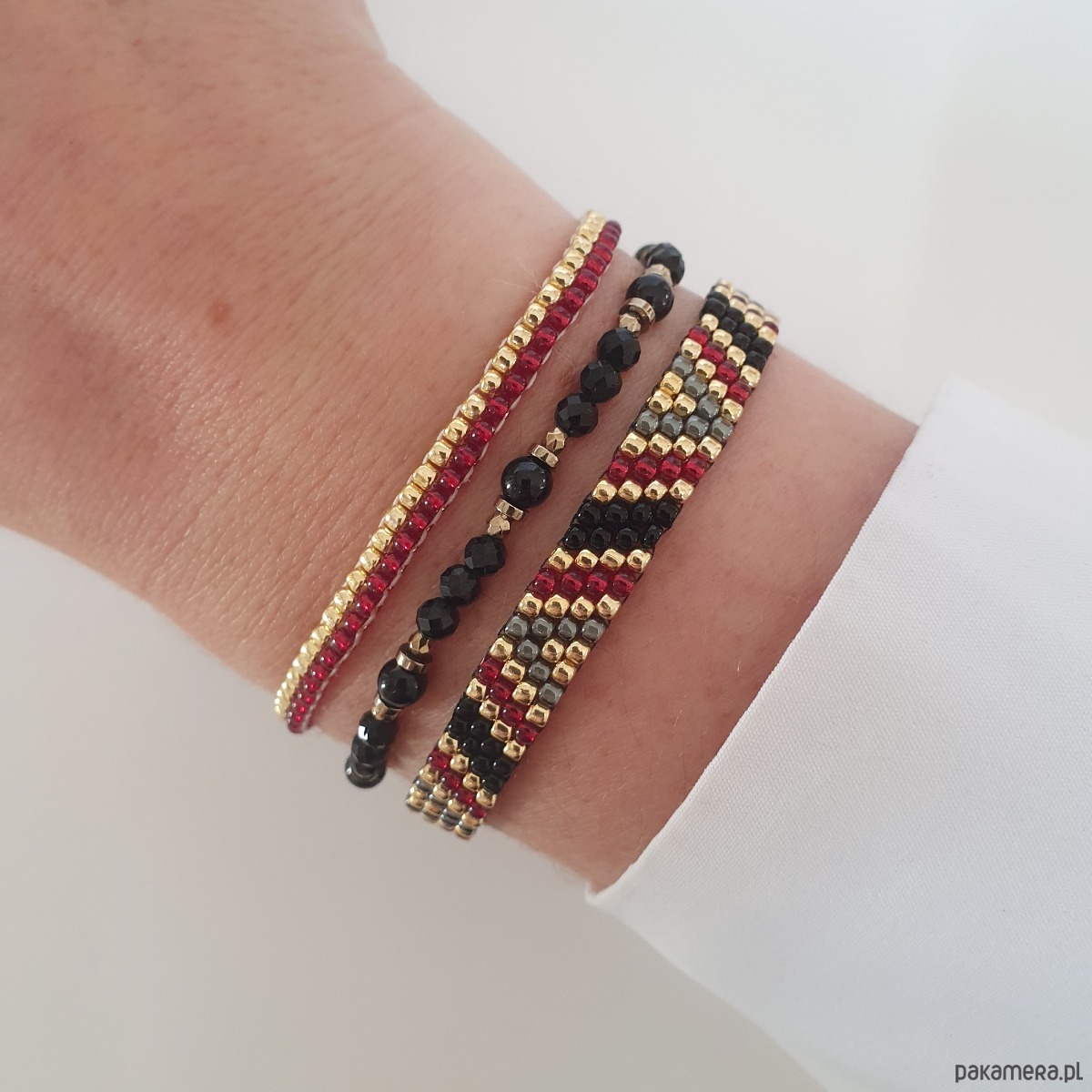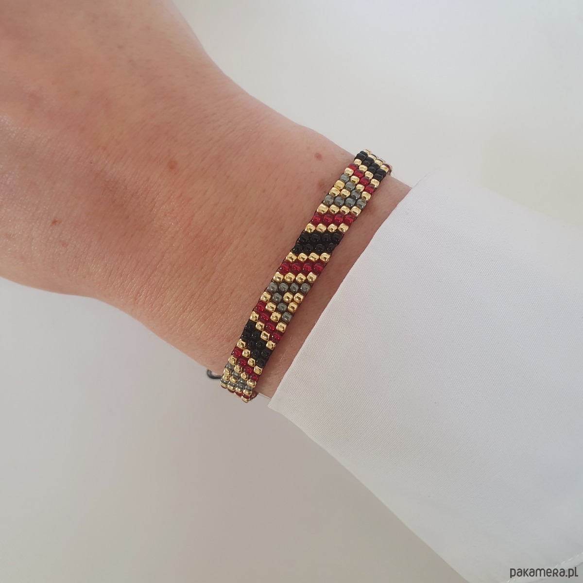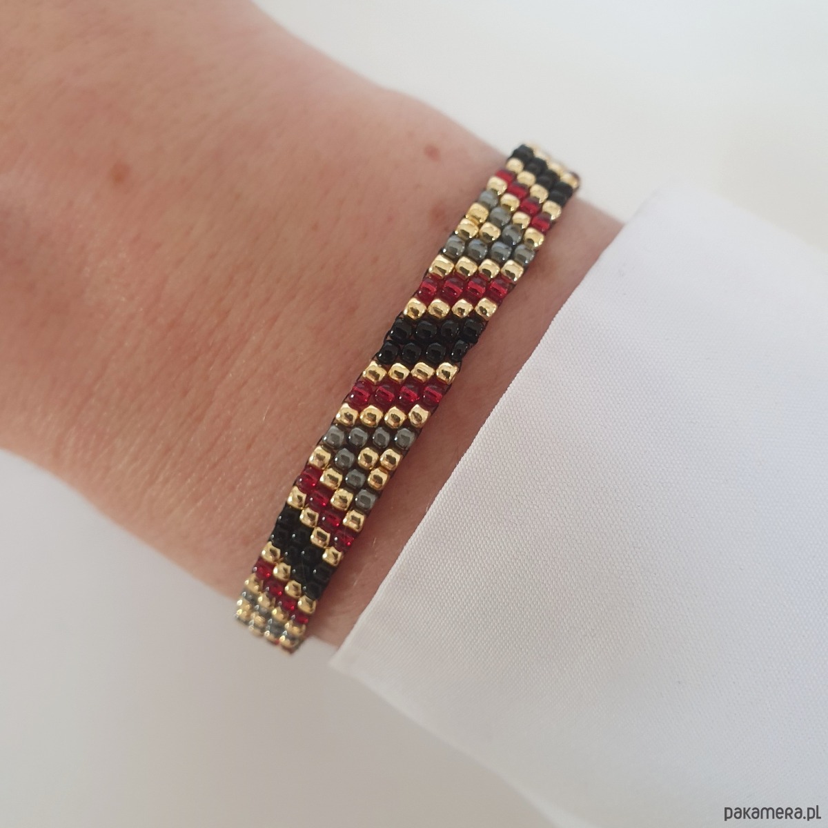 Bransoletka szyta ręcznie z koralików ze szkła japońskiego w kolorach: czarny, bordo i złoty. Regulowane zapięcie pozwala na dowolne dopasowanie do nadgarstka.