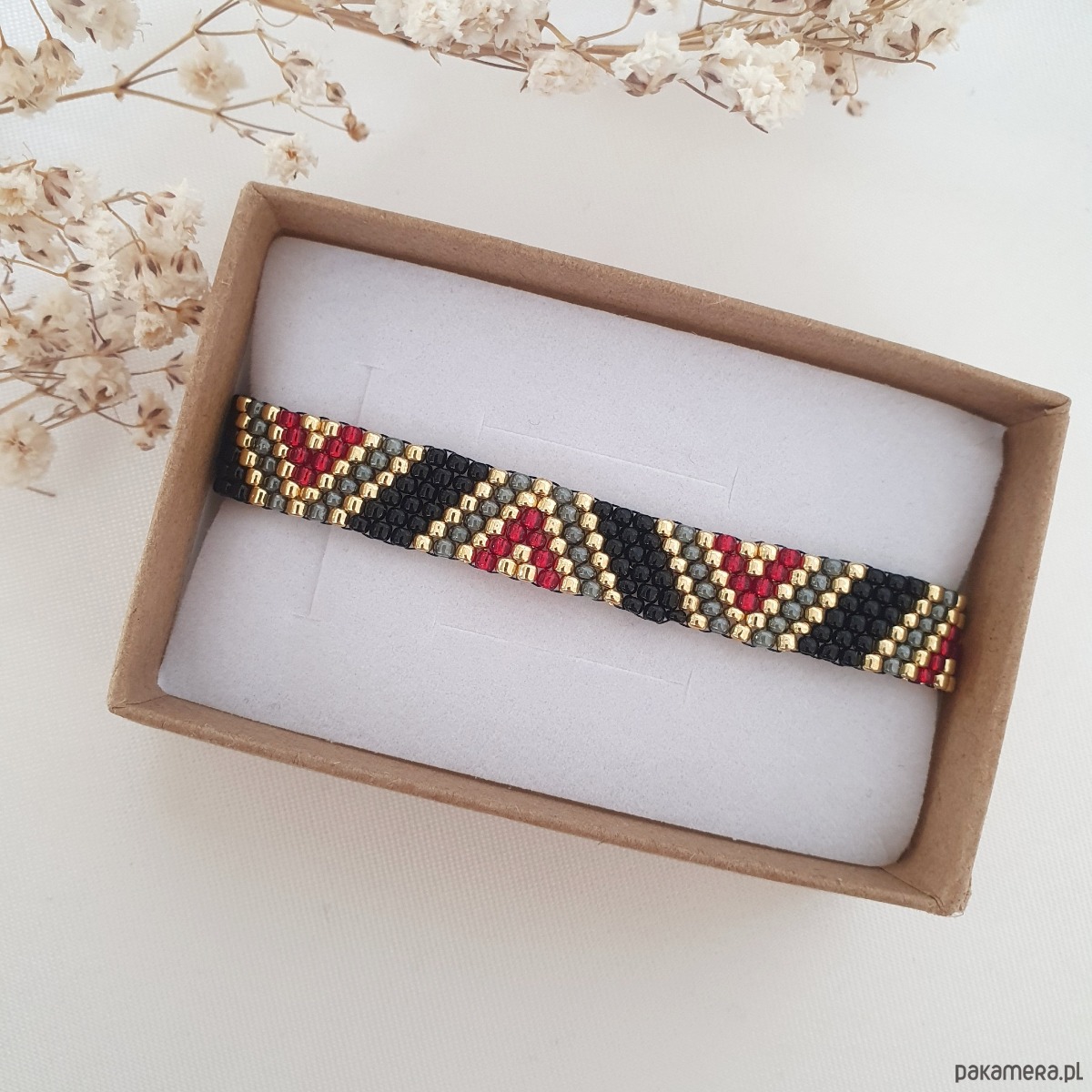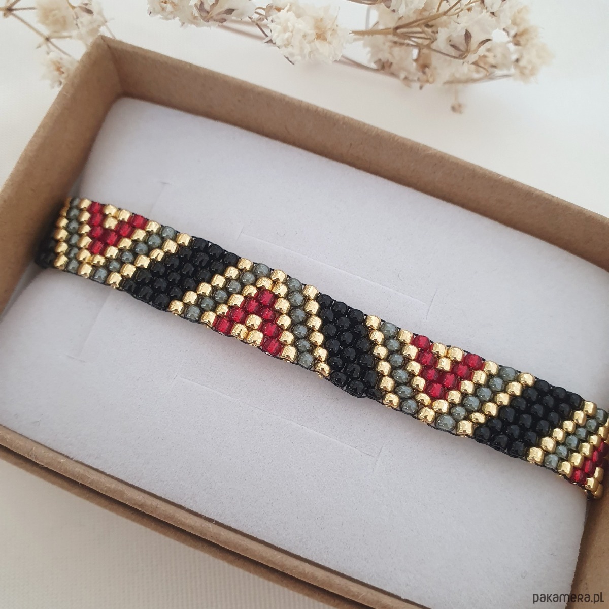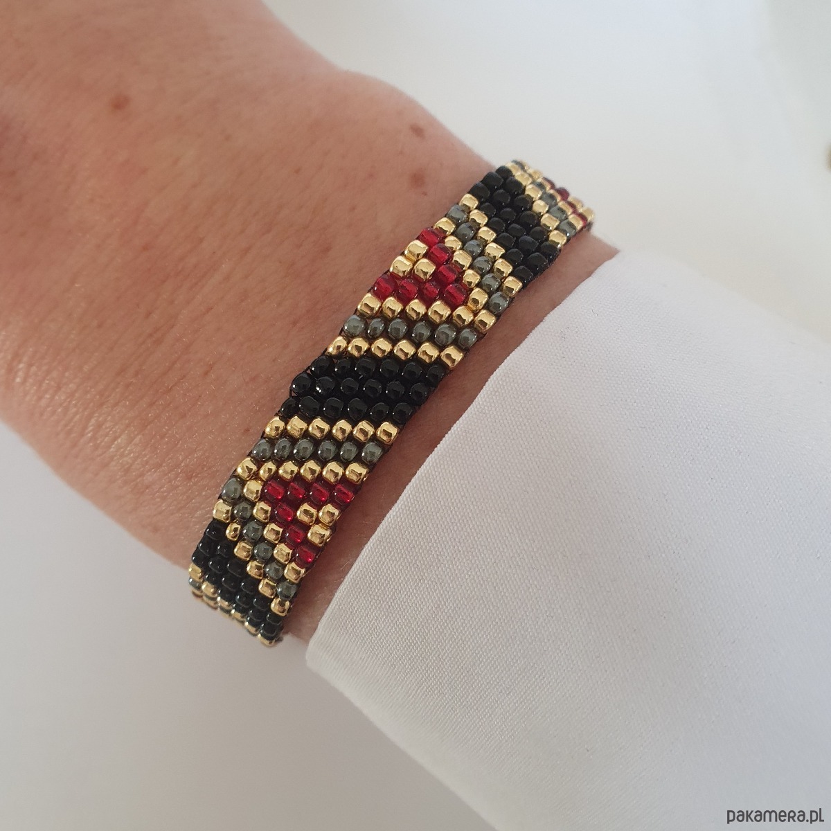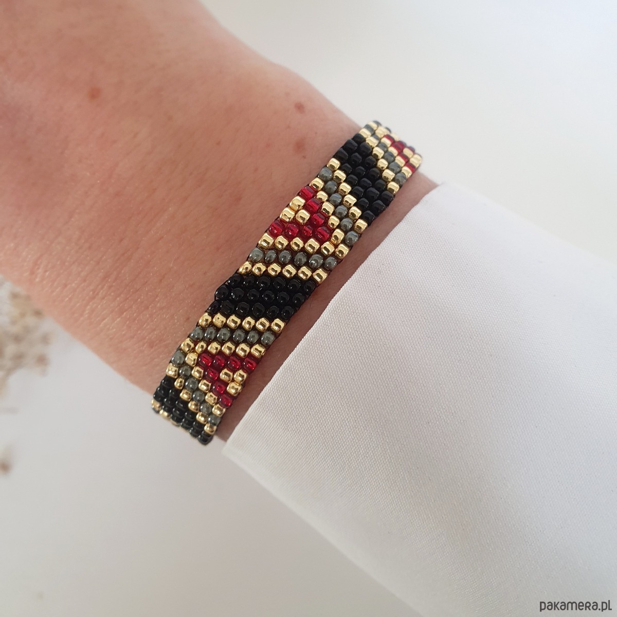 Bransoletka szyta ręcznie z koralików ze szkła japońskiego w kolorach: czarny, bordo i złoty. Regulowane zapięcie pozwala na dowolne dopasowanie do nadgarstka.
