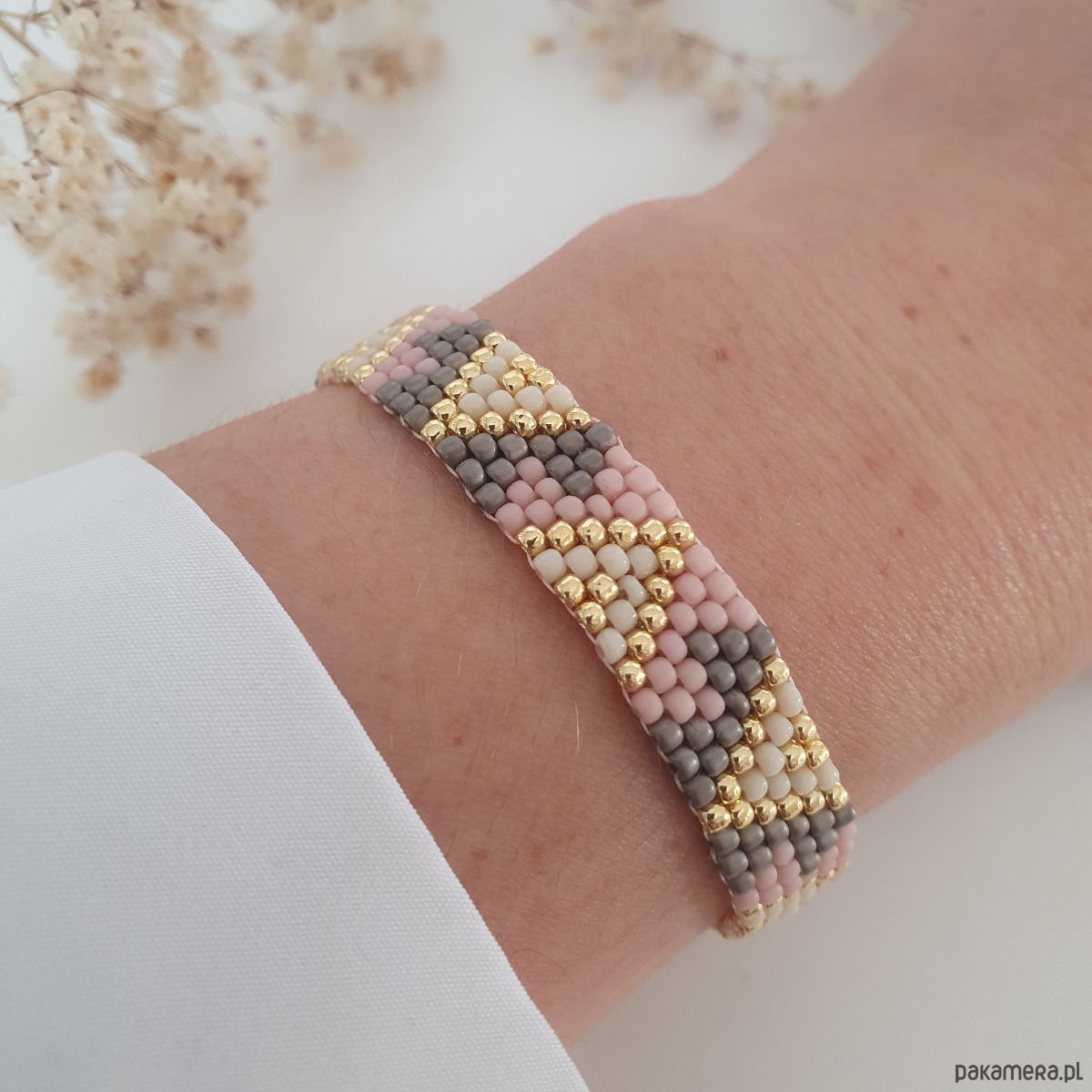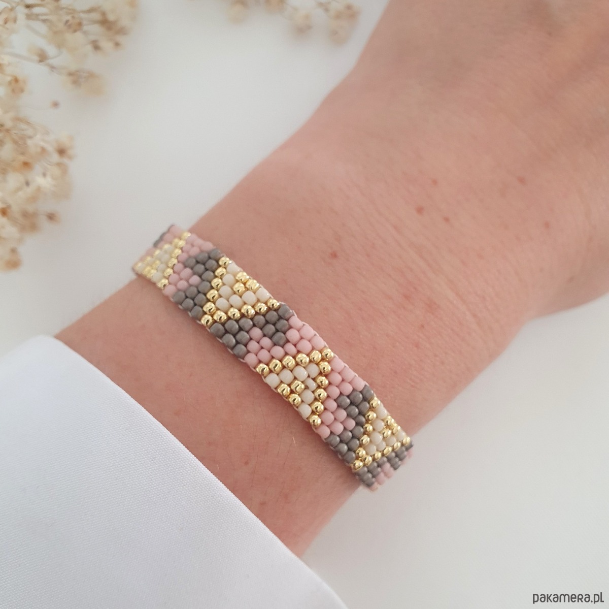 Delikatna i wyjątkowa bransoletka handmade, wykonana z drobnych koralików ze szkła japońskiego w subtelnych odcieniach różu, kremu i szarości. Każdy element został starannie zszyty ręcznie, tworząc harmonijny wzór o kobiecym i eleganckim charakterze.
