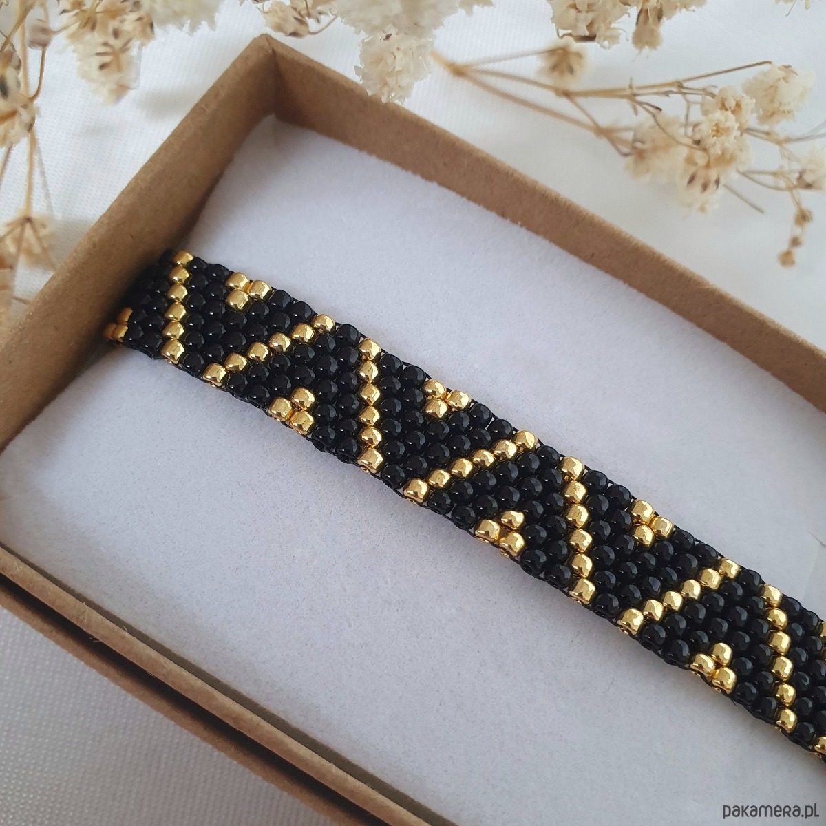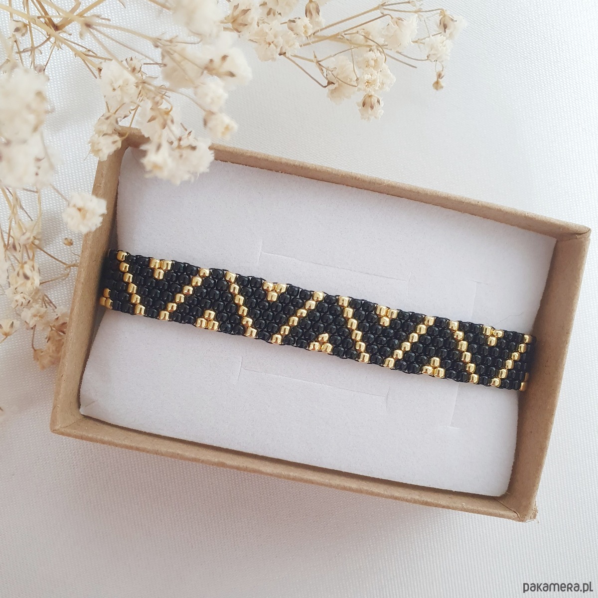 Elegancka i ponadczasowa bransoletka handmade, wykonana ze szklanych koralików japońskich w odcieniach czerni i złota. Starannie zszywana ręcznie tworzy wyjątkowy, geometryczny wzór, który pięknie prezentuje się na nadgarstku.