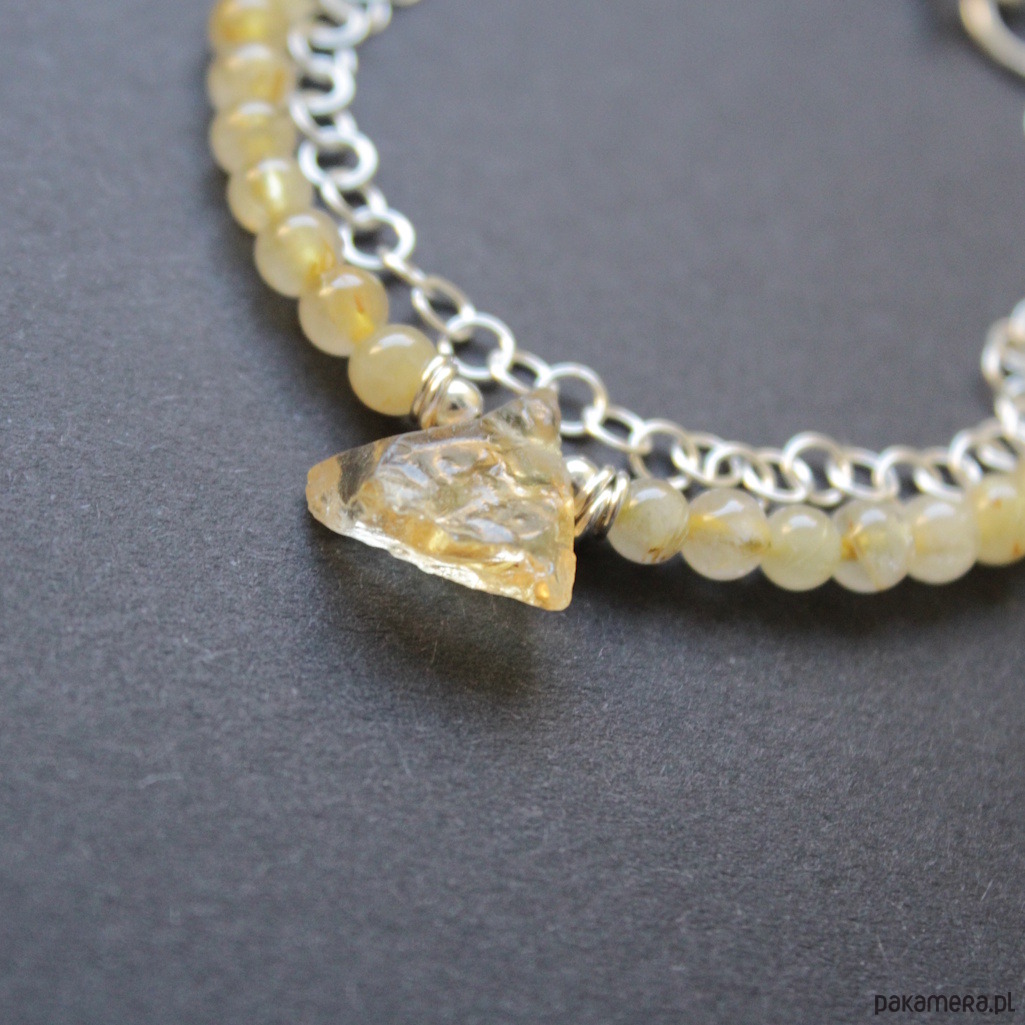 Bransoletka ozdobiona została surową bryłką surowego cytrynu wielkości 0,8 cm.