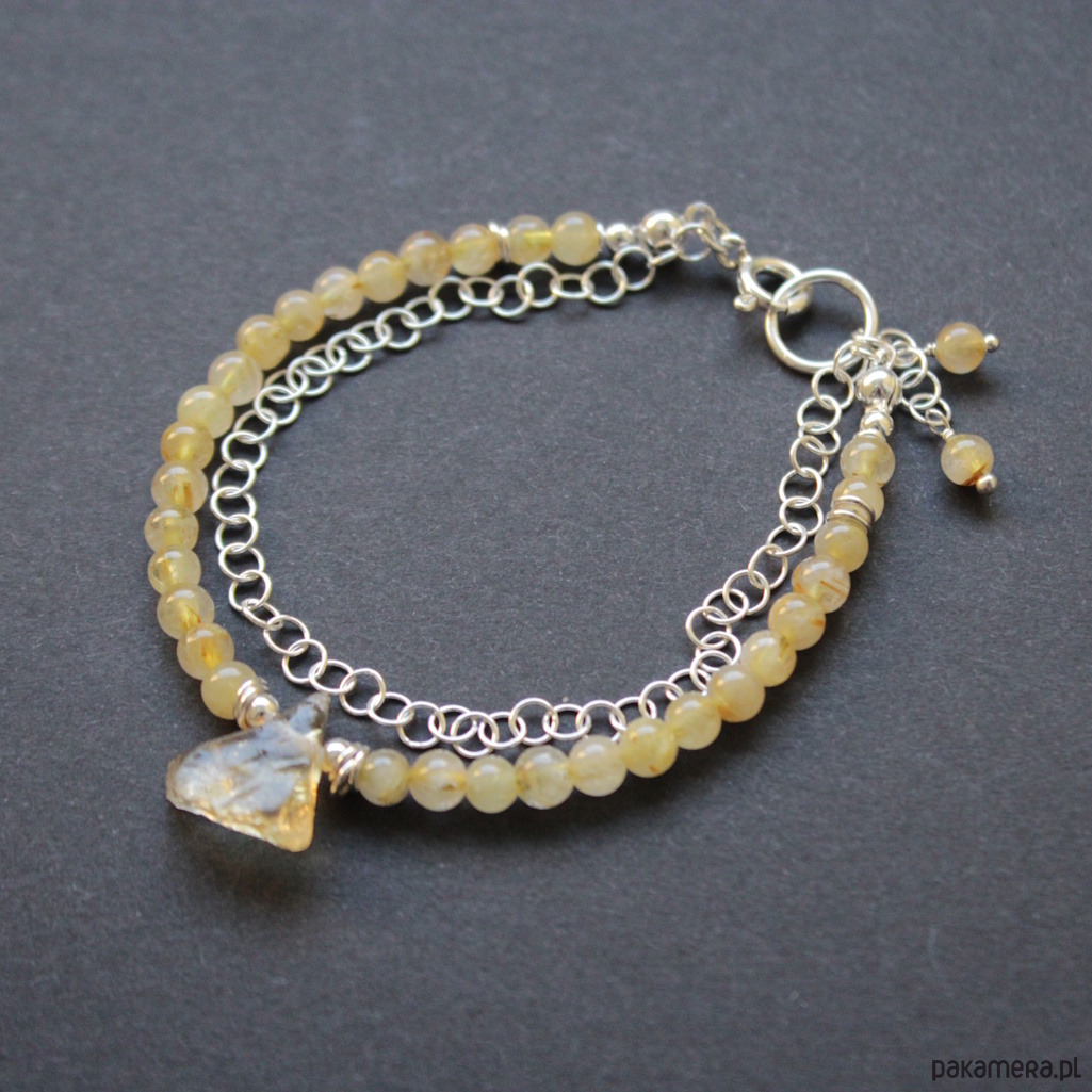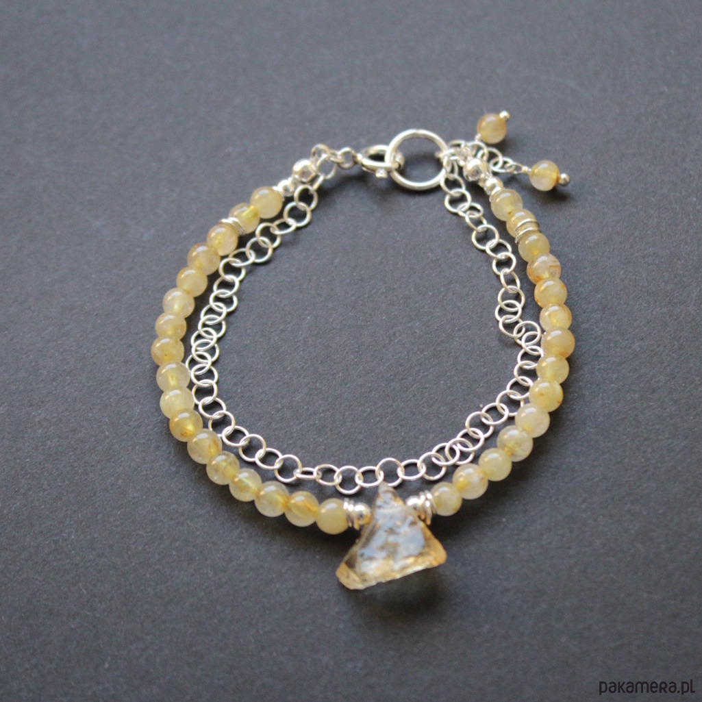 Bransoletka ozdobiona została surową bryłką surowego cytrynu wielkości 0,8 cm.