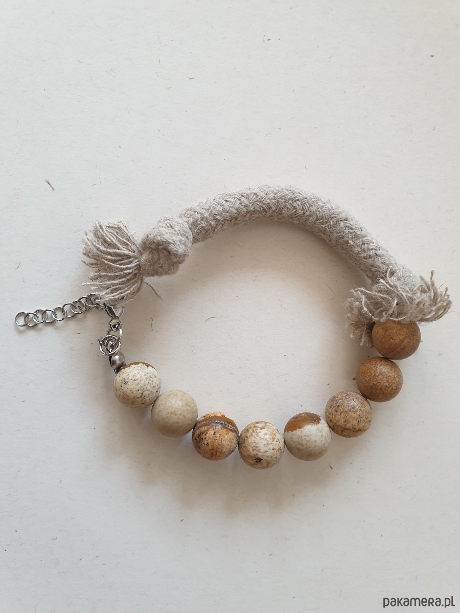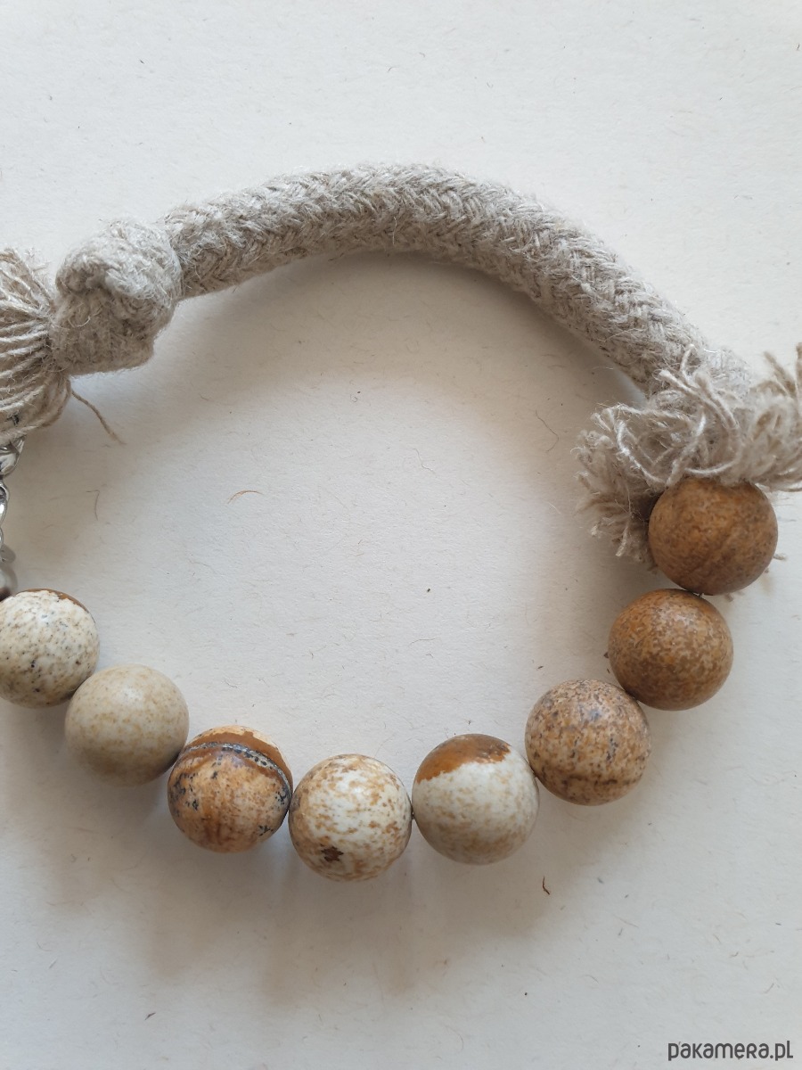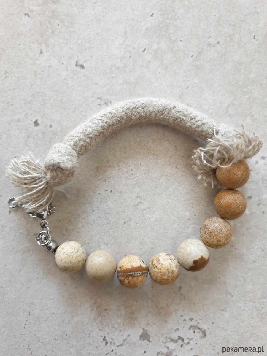 Autorska minimalistyczna bransoletka z kolekcji WĘZŁY z dużymi kamieniami. Tworzona ręcznie z kamieni naturalnych, elementów ze stali szlachetnej (antyalergicznej) i lnianego sznura. W tej - kulka jaspis obrazkowy. Na zdjęciu przykładowa sztuka, bransoletki tworzę na zamówienie z tych samych kamyczków, zachowując tą samą tonacje kolorystyczną, ale mogą się minimalnie różnić