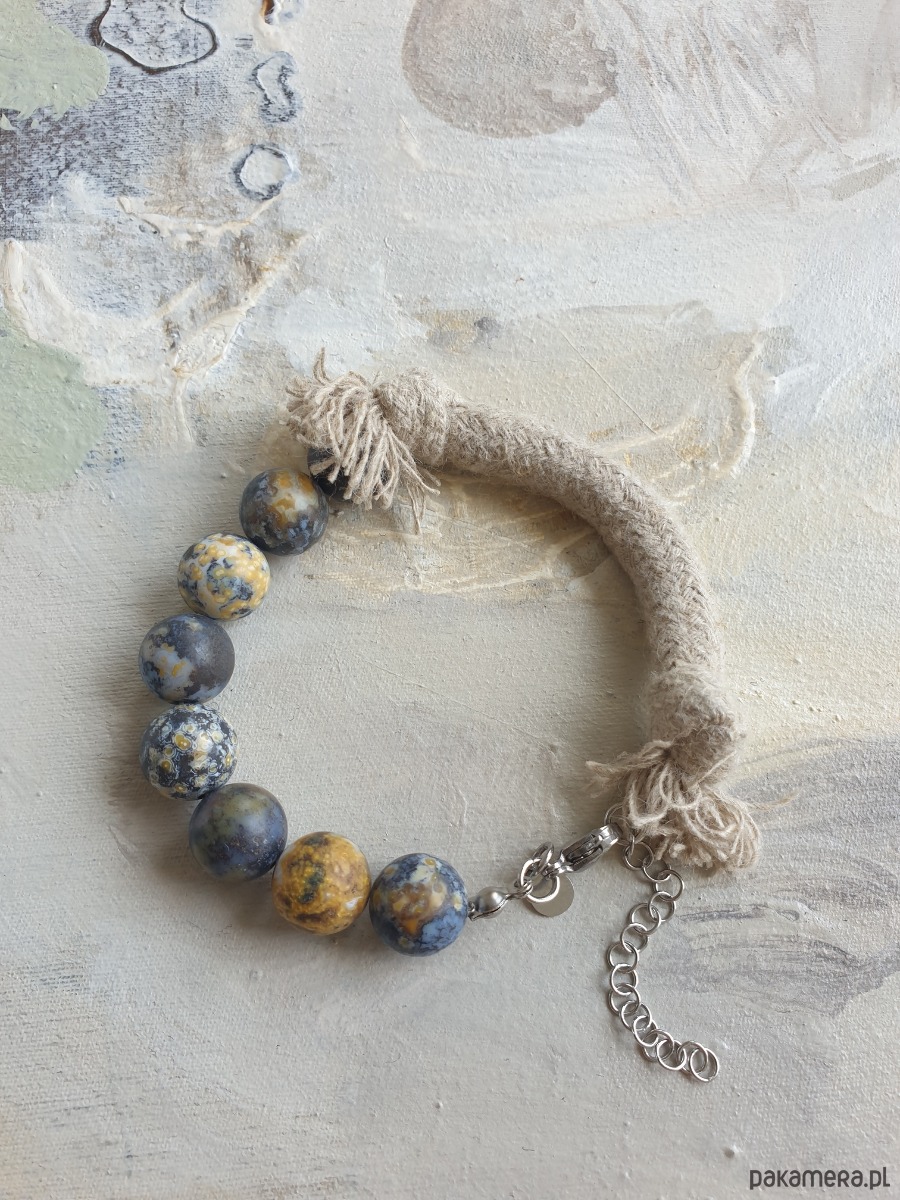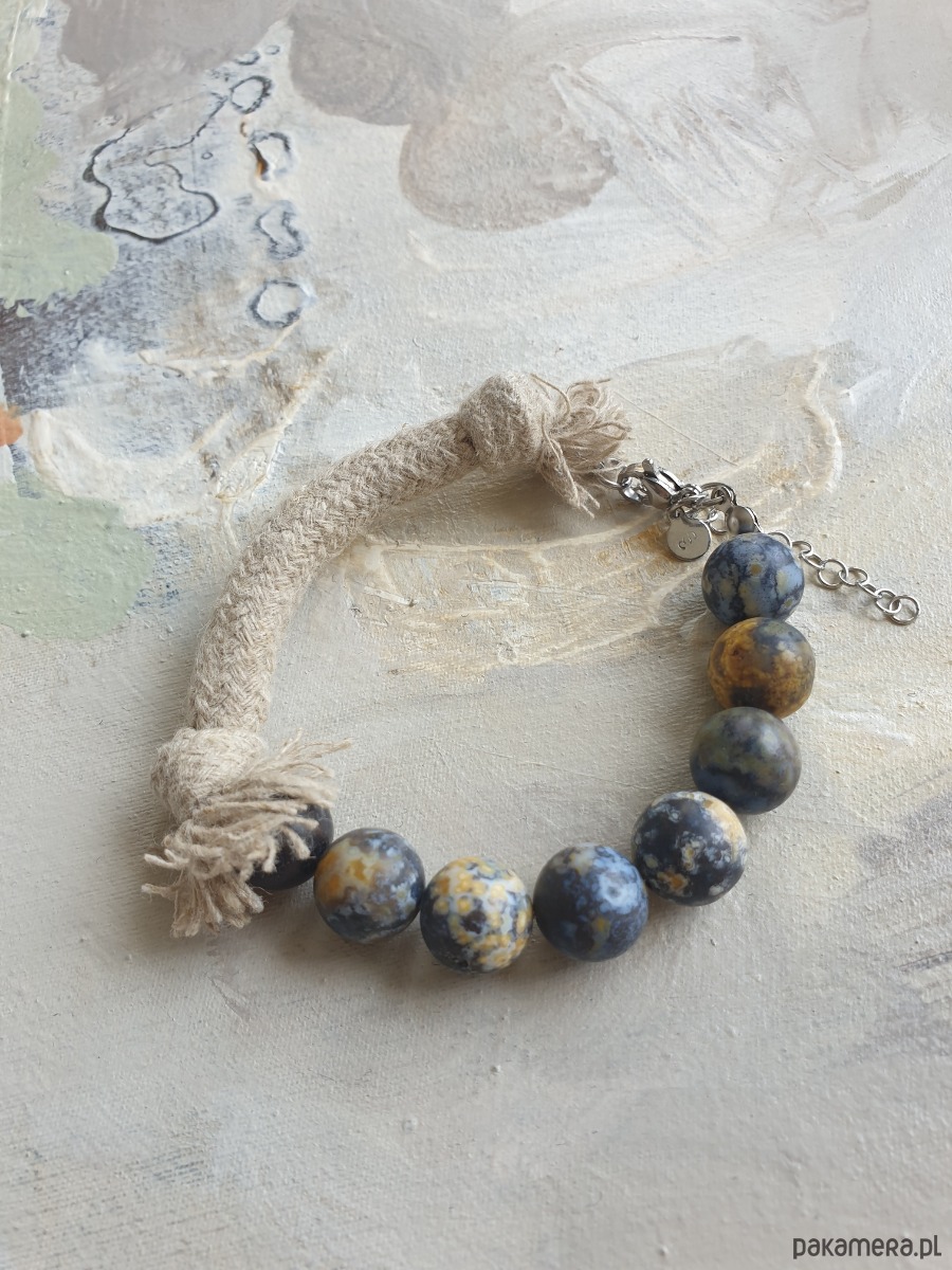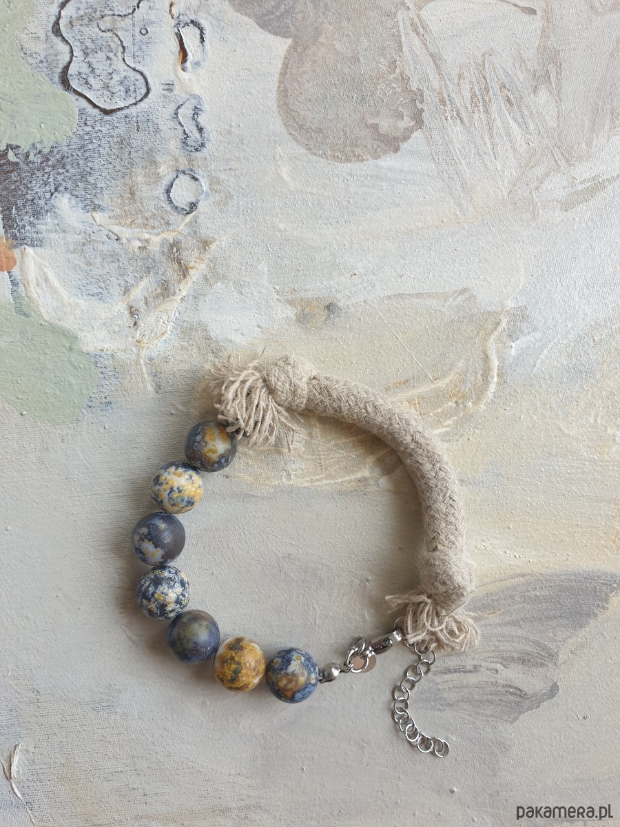 Autorska minimalistyczna bransoletka z kolekcji WĘZŁY z dużymi kamieniami. Tworzona ręcznie z kamieni naturalnych, elementów ze stali szlachetnej (antyalergicznej) i lnianego sznura. W tej - kulka jaspis oceaniczny. Na zdjęciu przykładowa sztuka, bransoletki tworzę na zamówienie z tych samych kamyczków, zachowując tą samą tonacje kolorystyczną, ale mogą się minimalnie różnić.