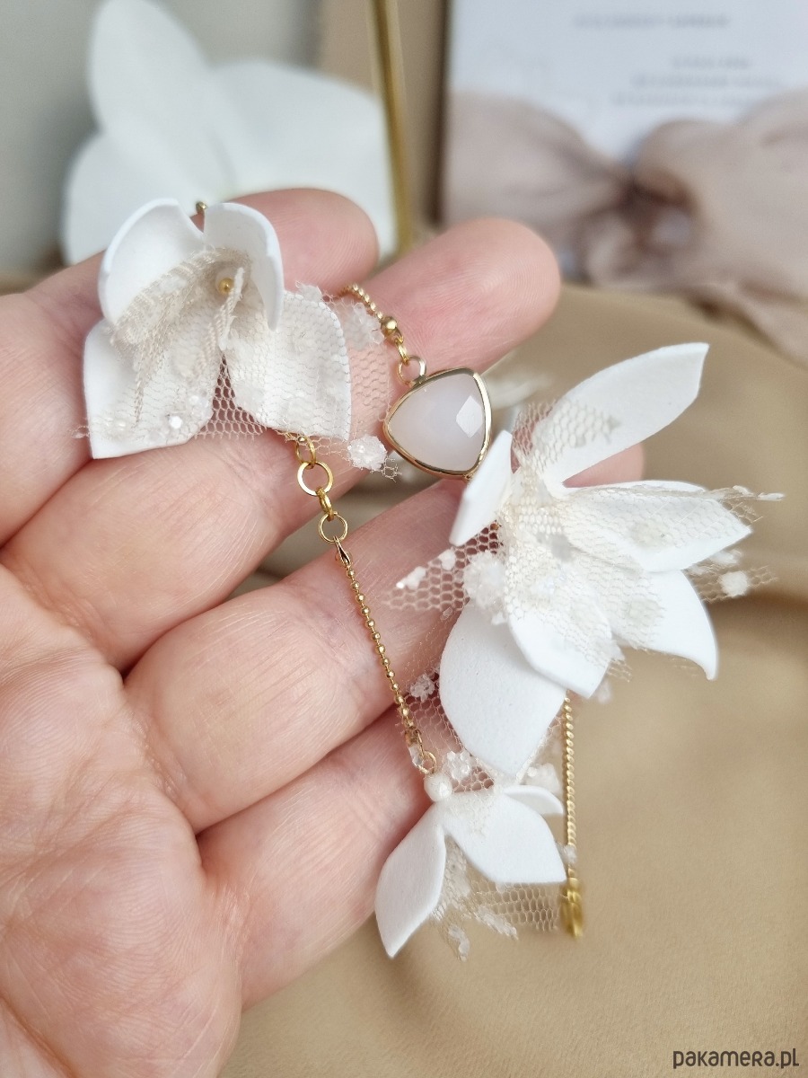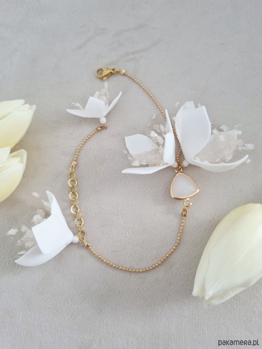 Efektowna bransoletka z kwiatami z klasycznej pianki w połączeniu z brokatowym tiulem pięknie ozdobi nadgarstek Panny Młodej.