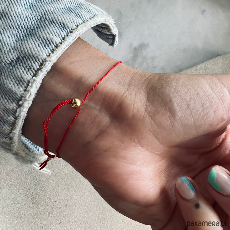 Bransoletka na jedwabnej nici. Srebrne kuleczki i zapięcie stoper wykonane ze srebra próby 925 pokrytym 24-karatowym złotem.