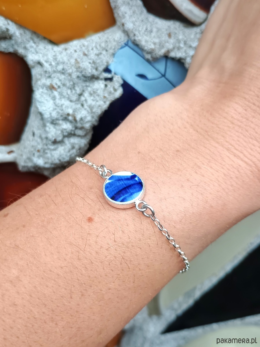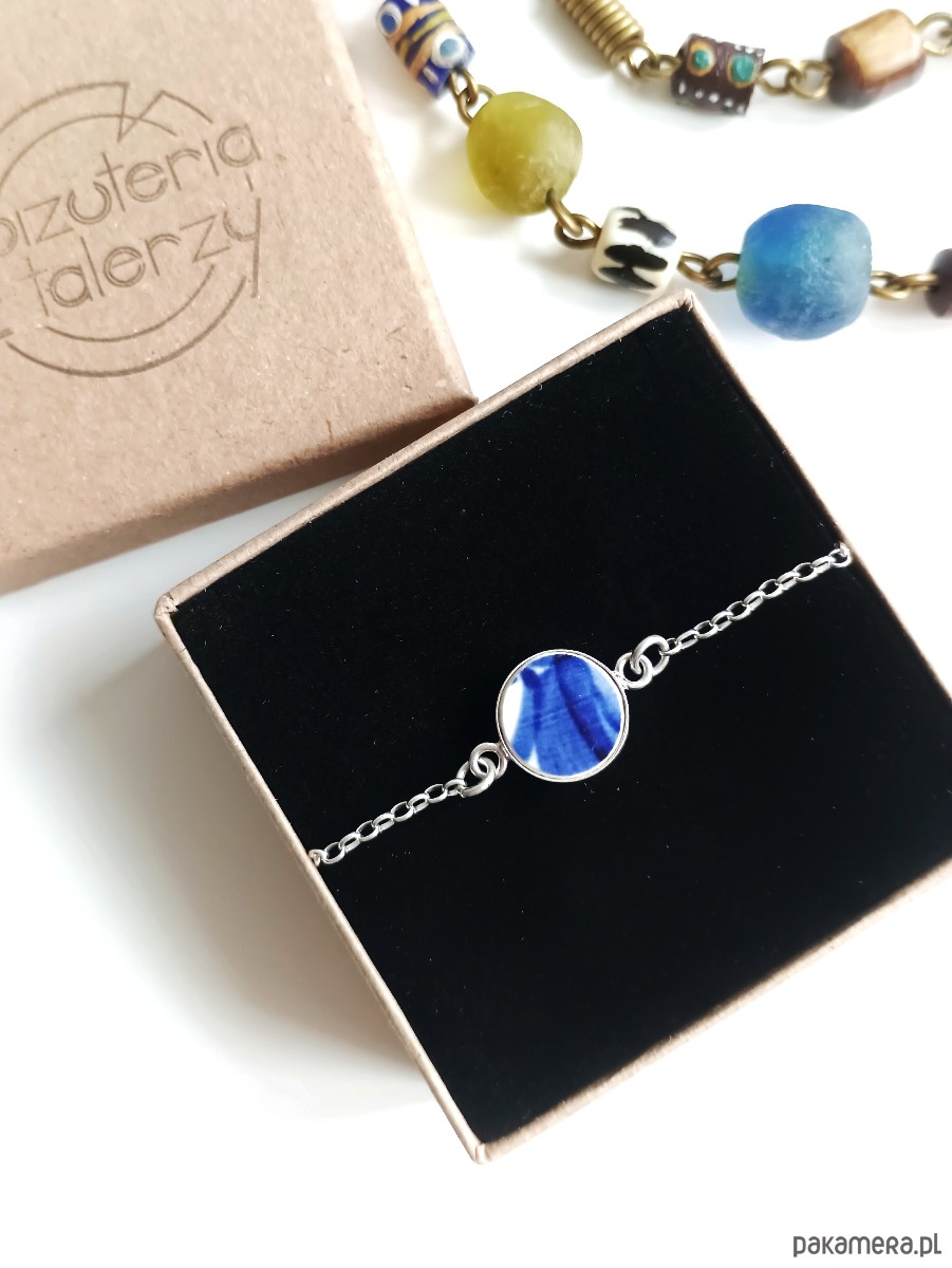 Historia fajansu włocławskiego sięga 1873 roku. Zakładów było kilka, zmieniali się właściciele i lokalizacje. Produkcja najbardziej rozwinęła się po II WŚ, kiedy w miejscowych zakładach powstawał nie tylko fajans, ale również porcelit i porcelana. Zróżnicowane było także wzornictwo - produkowano nie tylko naczynia, ale również elementy wyposażenia wnętrz (lampy, świeczniki, żyrandole). Mimo tej różnorodności, najbardziej rozpoznawalnym wyrobem z Włocławka jest talerz w ręcznie malowane kobaltowe kwiaty (z takich najchętniej korzystam :). I mimo, że najdłużej działająca fabryka zakończyła działalność w 1991 roku, dzięki lokalnym inicjatywom produkcja fajansu została wznowiona i trwa do dziś! Oto delikatna bransoletka, którą wykonałam z fragmentu fajansu włocławskiego ręcznie malowanego w kobaltowe kwiaty. Kawałek stłuczki oszlifowałam, osadziłam w srebrnej oprawie i zamocowałam na srebrnym łańcuszku (srebro 925). Długość łańcuszka w całości: 18 cm. Średnica zawieszki: 12 mm. Bransoletkę można zapiąć na dowolne ogniwko, co daje możliwość regulacji rozmiaru. Na końcu łańcuszka zamocowałam zawieszkę w kształcie kuli, również ze srebra. Unikat - każdy z moich wyrobów występuje w jednym egzemplarzu. Upcykling - nie reprodukuję wykorzystywanych wzorów, niczego nie domalowuję - wykorzystuję wyłącznie oryginalne naczynia i motywy, które się na nich znajdują. Tym samym, stłuczce z odzysku nadaję nowe życie.
