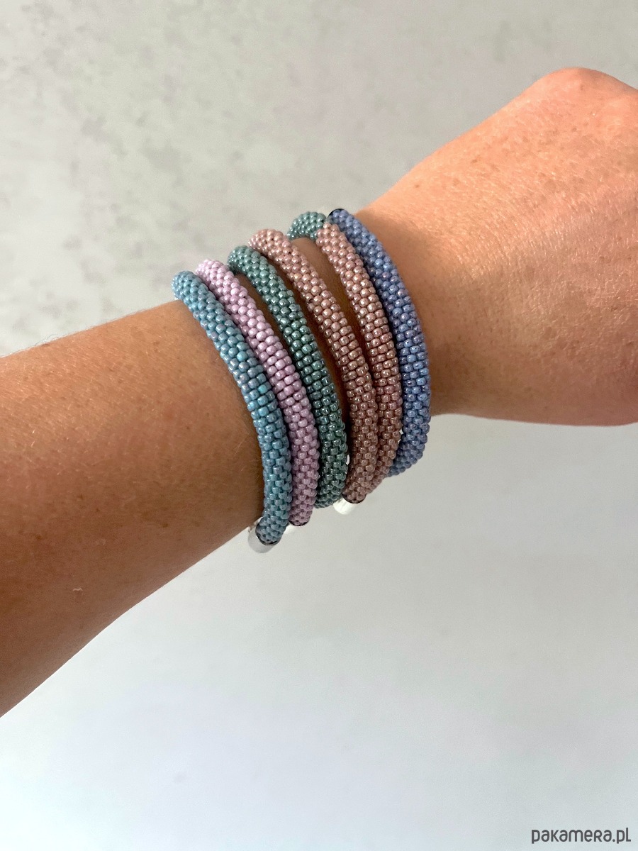 Bransoletka wykonana na szydełku z około 600 szklanych koralików o średnicy 2 mm, nawleczonych na wytrzymałą nić jubilerską.