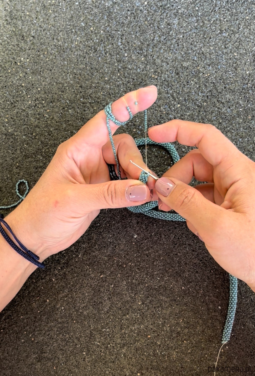Bransoletka wykonana na szydełku z około 600 szklanych koralików o średnicy 2 mm, nawleczonych na wytrzymałą nić jubilerską.