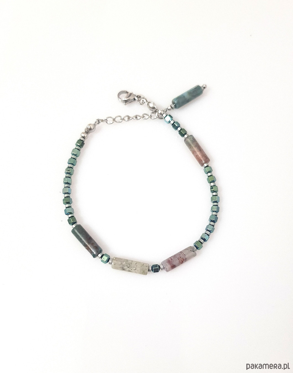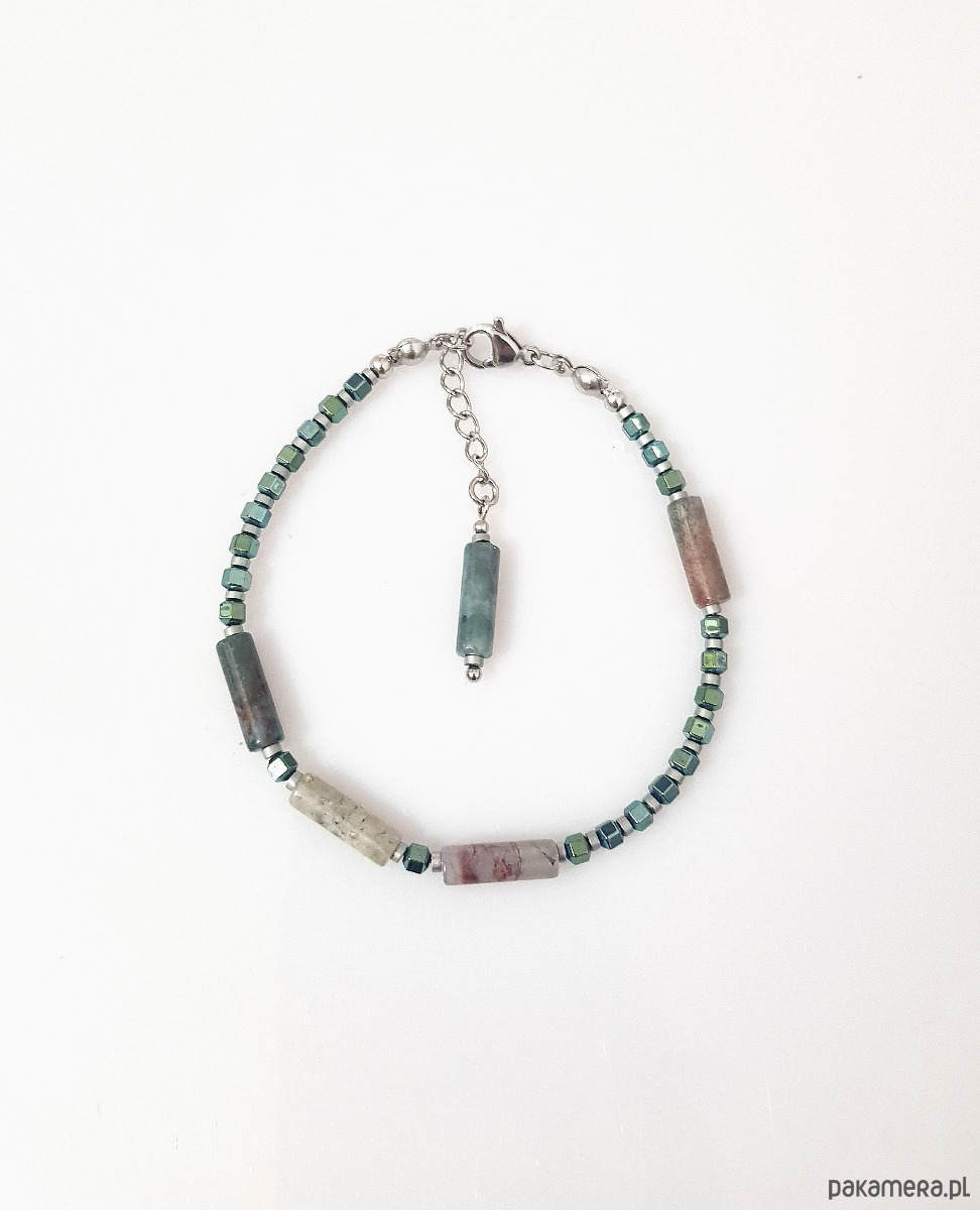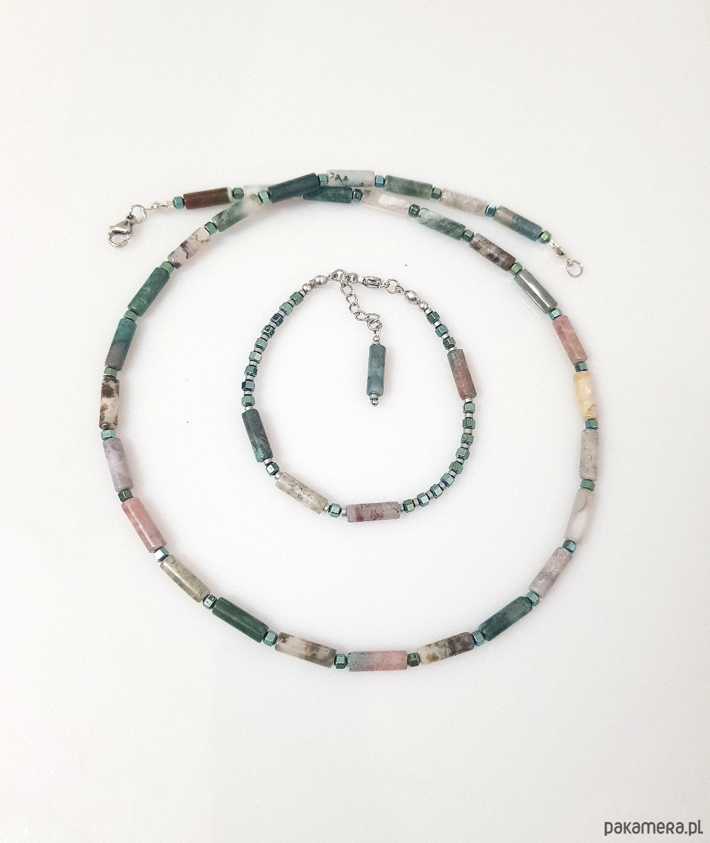 Agat indyjski w zachwycających kolorach ziemi i dodający industrialnego charakteru jasno zielony błyszczący hematyt.