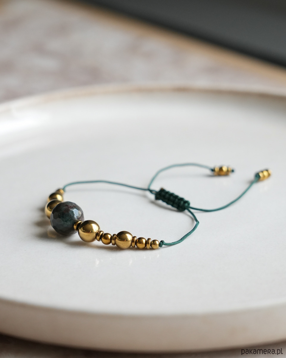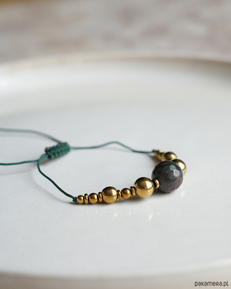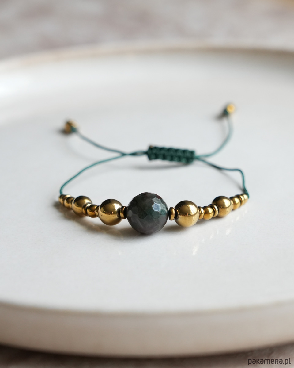 Bransoletka z dużym, fasetowanym AGATEM INDYJSKIM o zielono-brązowej barwie i HEMATYTAMI w kolorze ciemnego złota. Kamienie są nawleczone na mocny sznureczek w kolorze butelkowej zieleni.