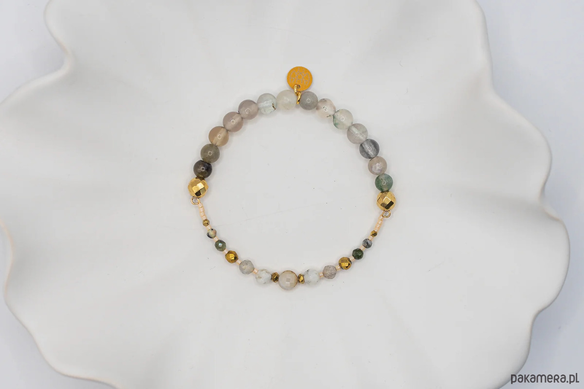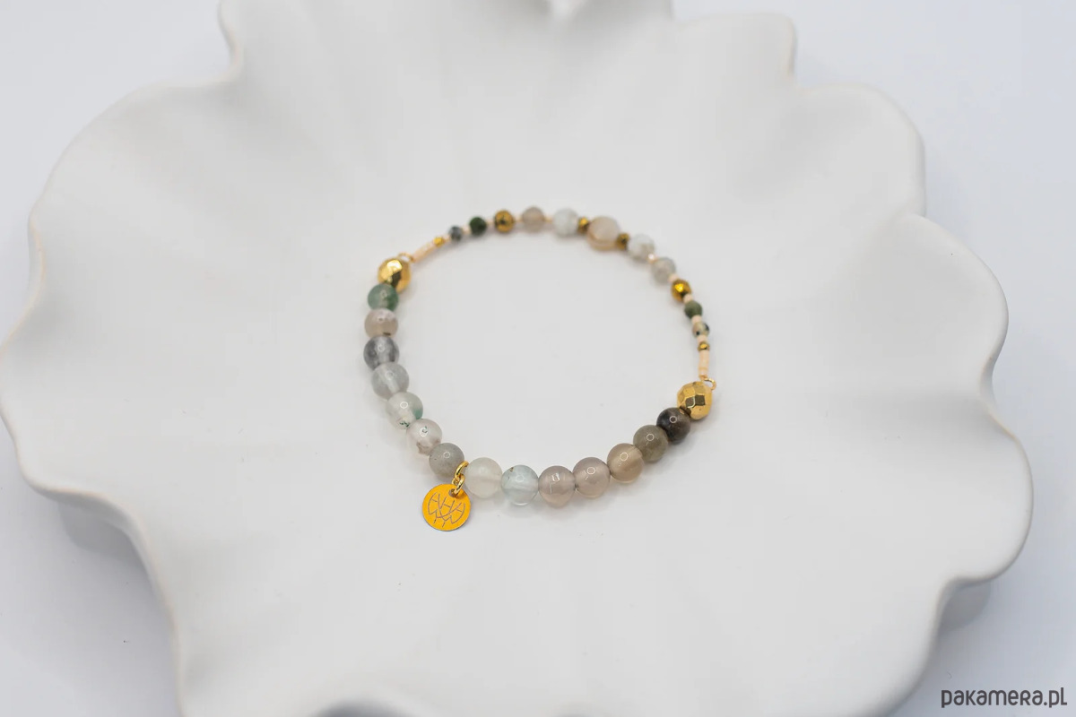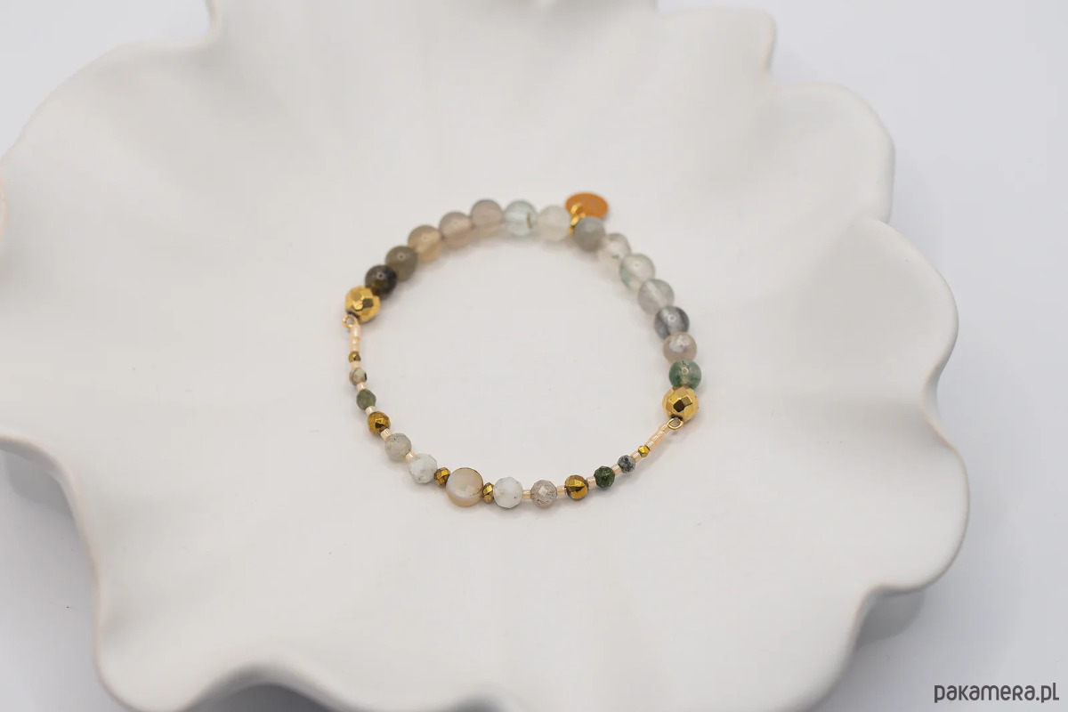 Bransoletka została wykonana przy użyciu okrągłego Agatu, który połączyliśmy z Kamieniem Księżycowym (Selenitem), Labradorytem oraz Turmalinem. W części elastycznej znajdują się Agaty oraz Kwarce (6 mm) a za wykończenie całości odpowiada Hematyt o pięknym złotym kolorze. Wszystkie elementy w biżuterii są 100% antyalergiczne.