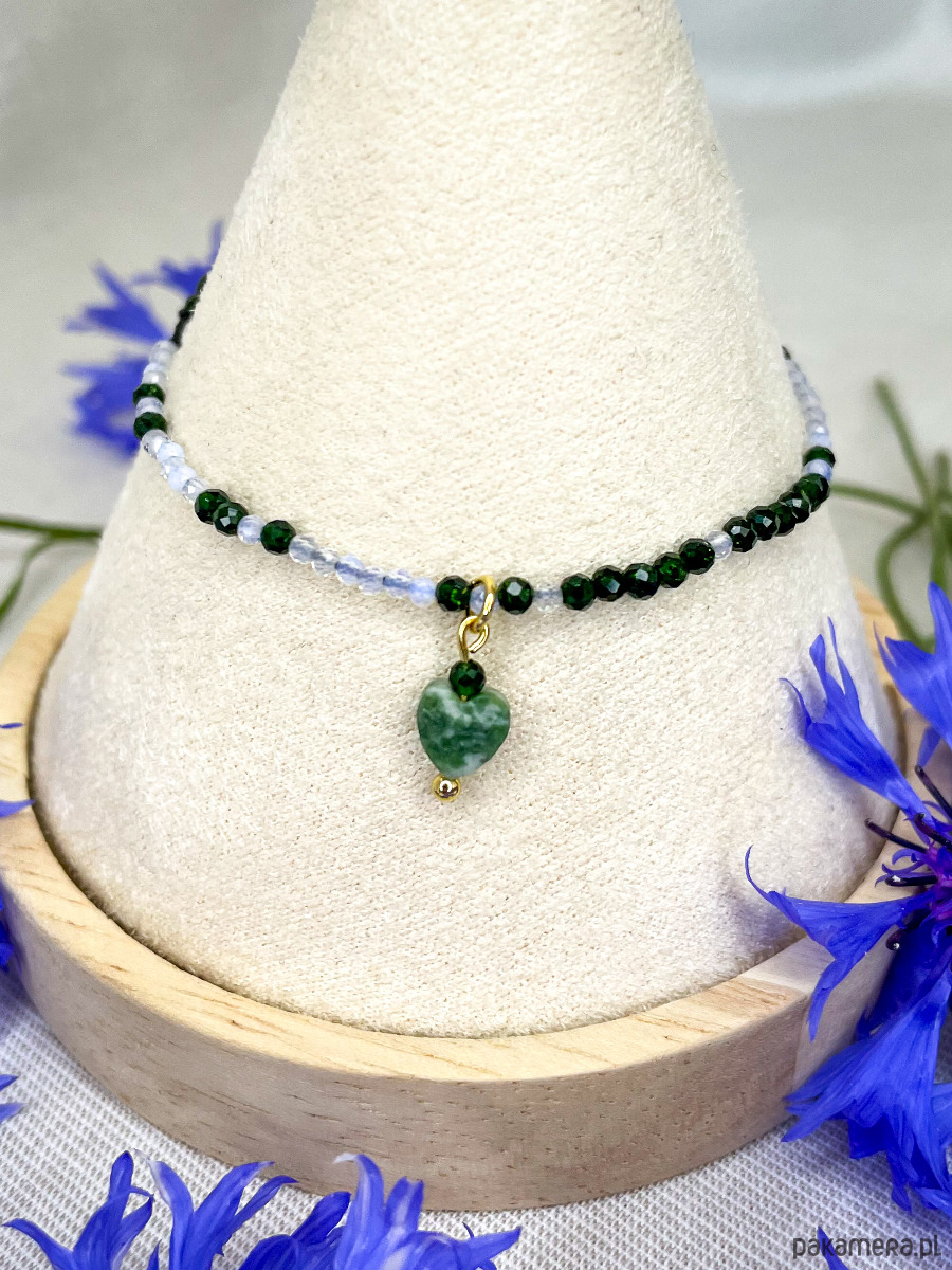 Awenturyn ciemnozielony 2,5mm; Opal kryształowy 2mm, Szmaragd Nilu 4mm, Agat mszysty serce 6mm