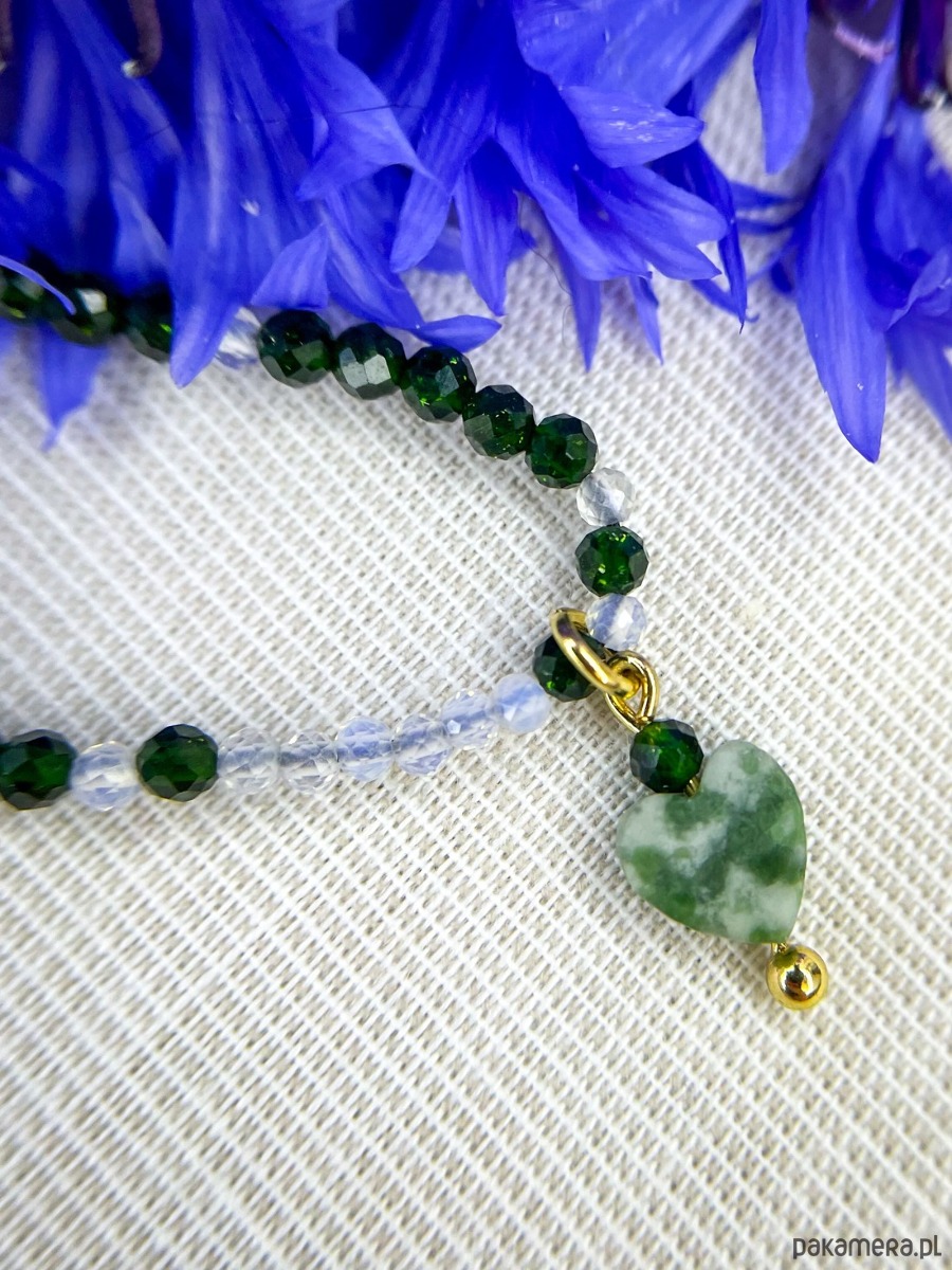 Awenturyn ciemnozielony 2,5mm; Opal kryształowy 2mm, Szmaragd Nilu 4mm, Agat mszysty serce 6mm