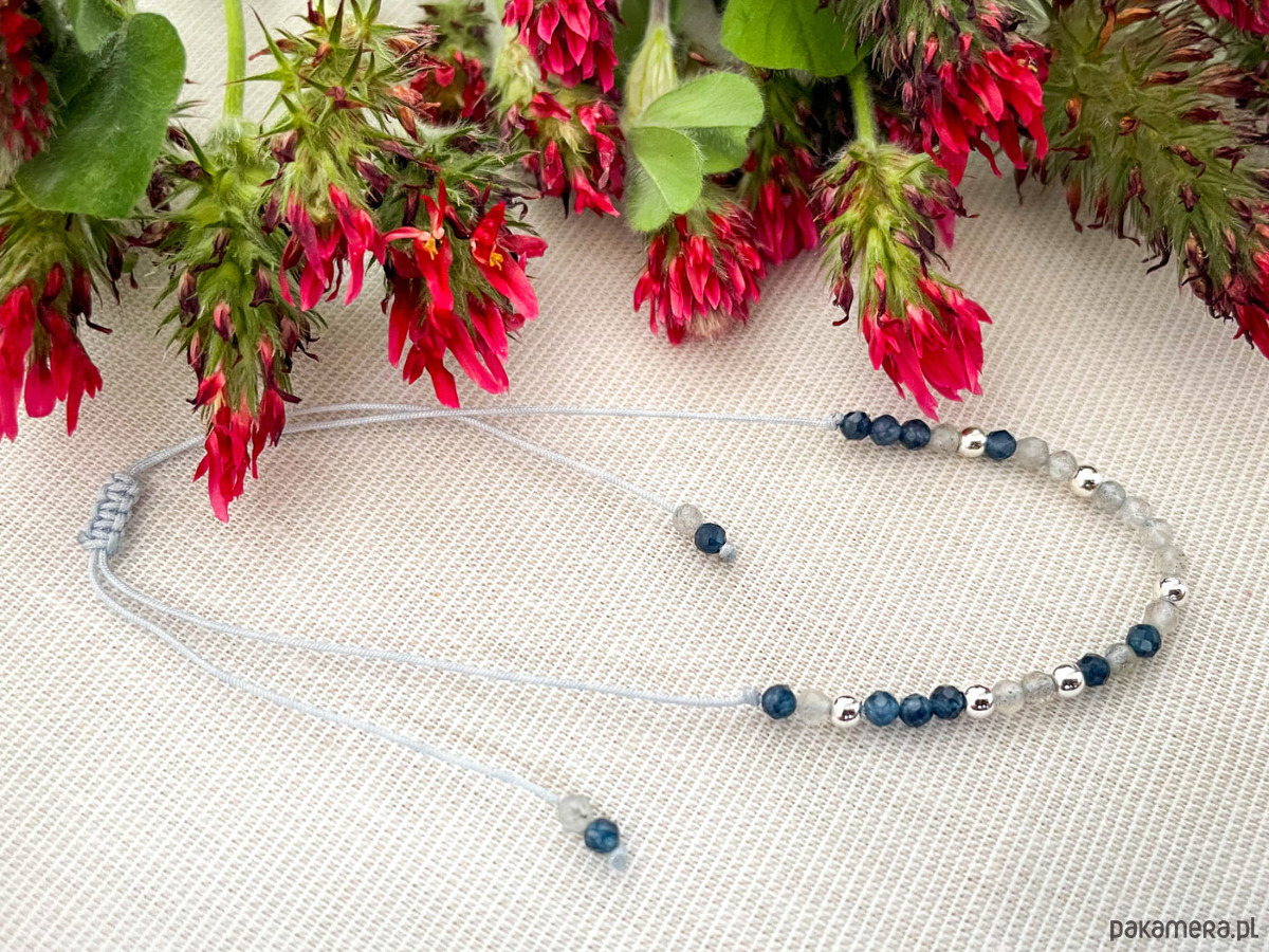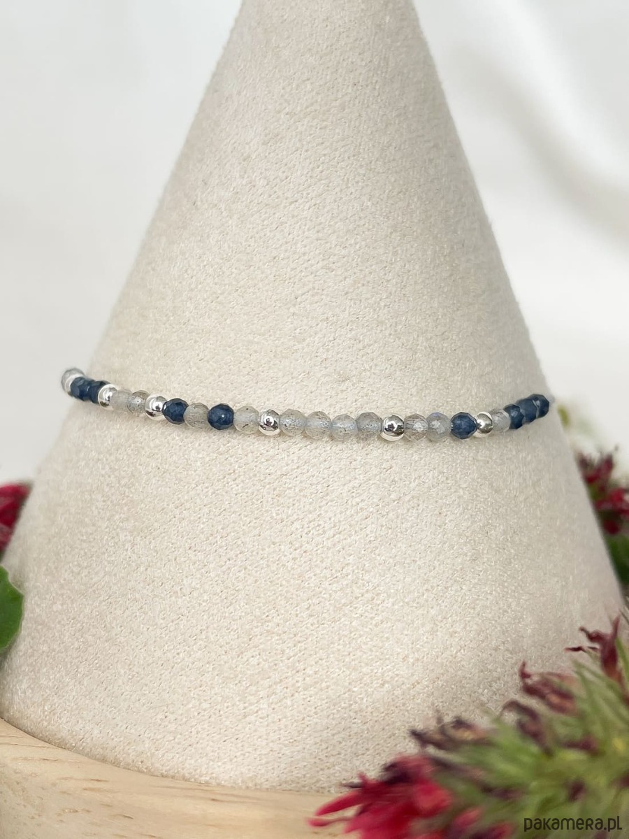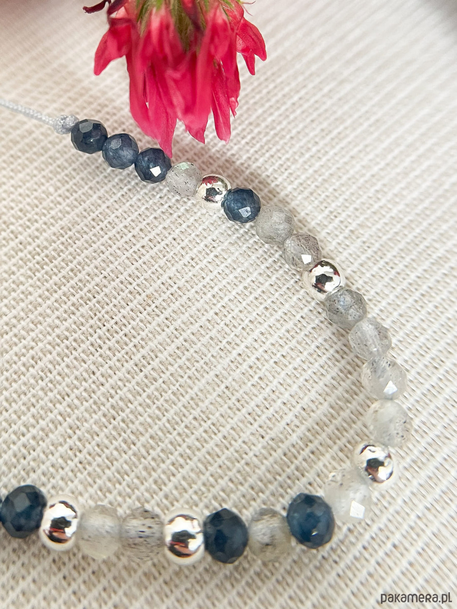 Bransoletka z alfabetem Morse Jadeit indygo, labradoryt, hematyt