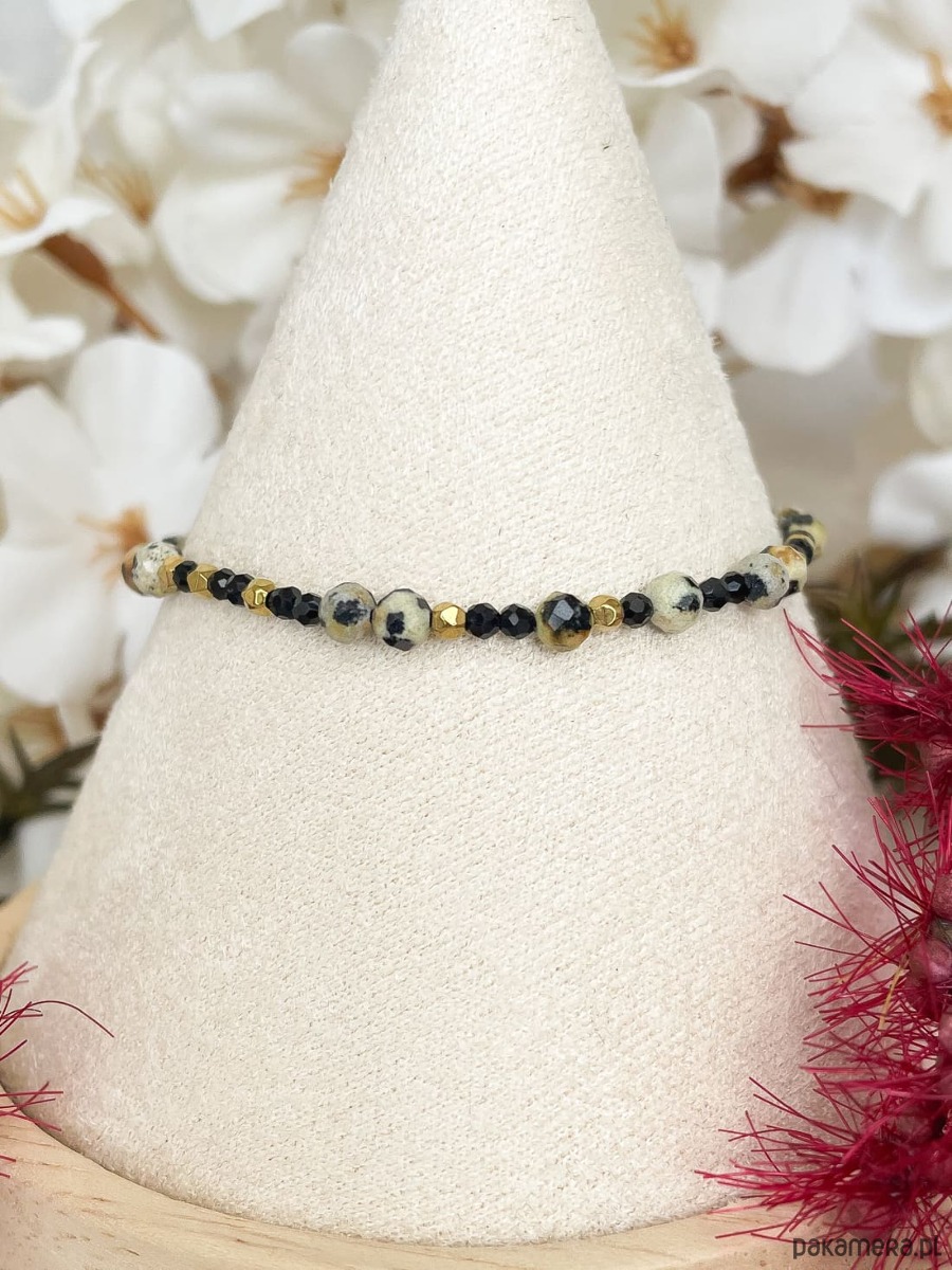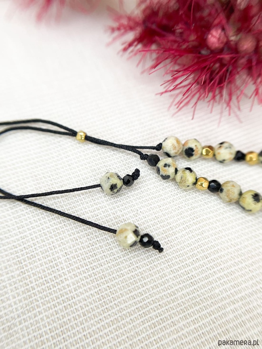 Bransoletka z alfabetem Morse Jaspis dalmatyński, hematyt, spinel