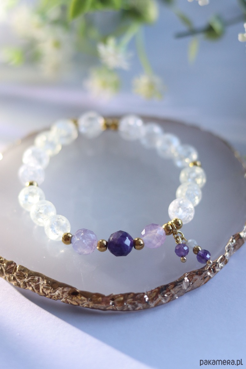 Ręcznie wykonana, wyjątkowa bransoletka stworzona z naturalnych kamieni Ametystu i Kryształu Górskiego. To połączenie harmonii, spokoju i czystej energii zamknięte w eleganckiej formie.