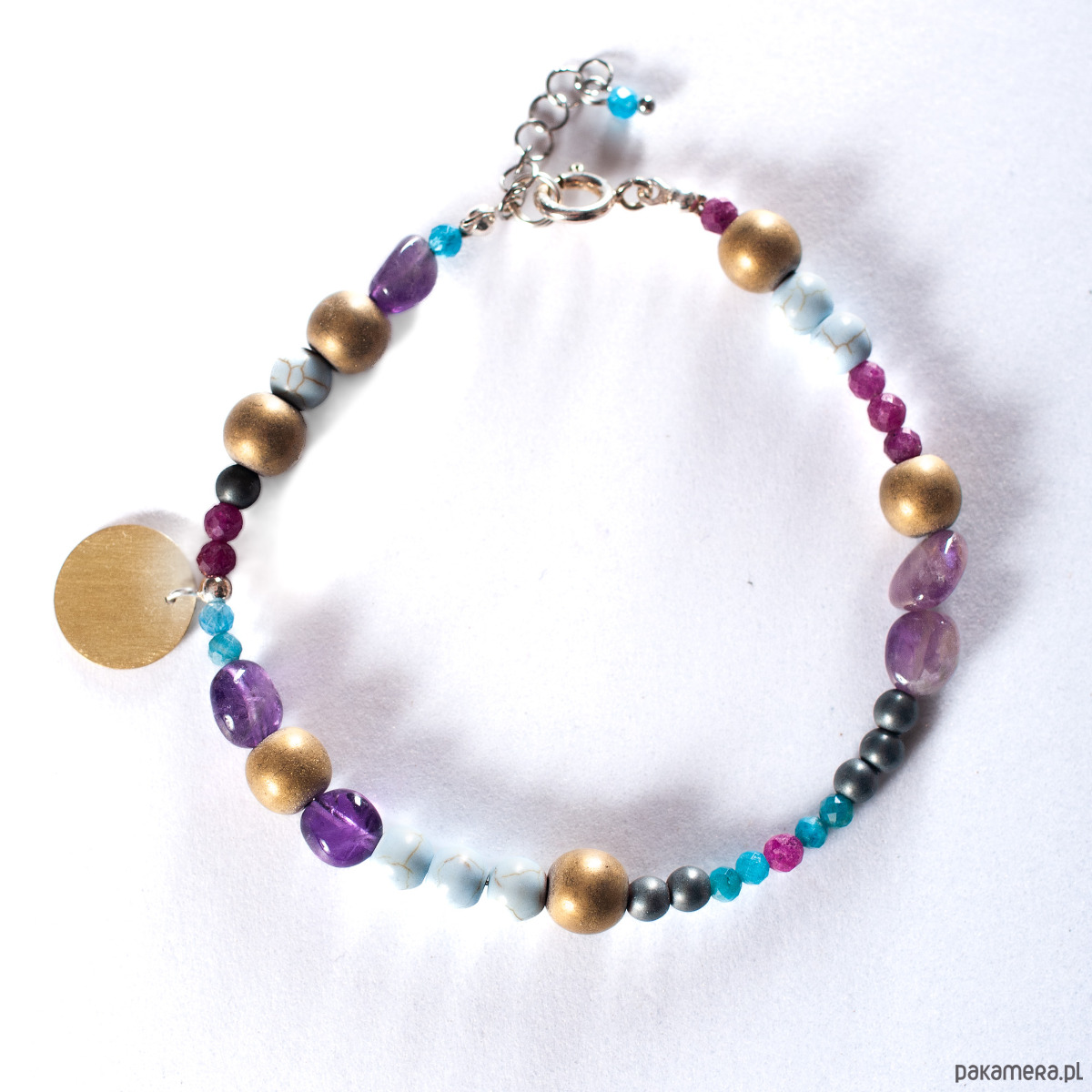 Piękna kolorowa bransoletka z kolekcji ŁĄKA. Kompozycja ametystów, apatytów, rubinów, hematytów i howlitów przywołuje obraz pięknej łąki w świetle zachodzącego słońca. Długości - 21 cm + 3 cm przedłużki. Średnica kółeczka z mosiądzu - 1,4 cm. Bigle wykonane są ze srebra 925. Skład: kamienie 92%, srebro 925 2%, stal szlachetna 3%, mosiądz 3% . Biżuterię wykonujemy ręcznie według własnych projektów w pracowni Anillo. Bransoletkę zapakujemy w elegancki kartonik.