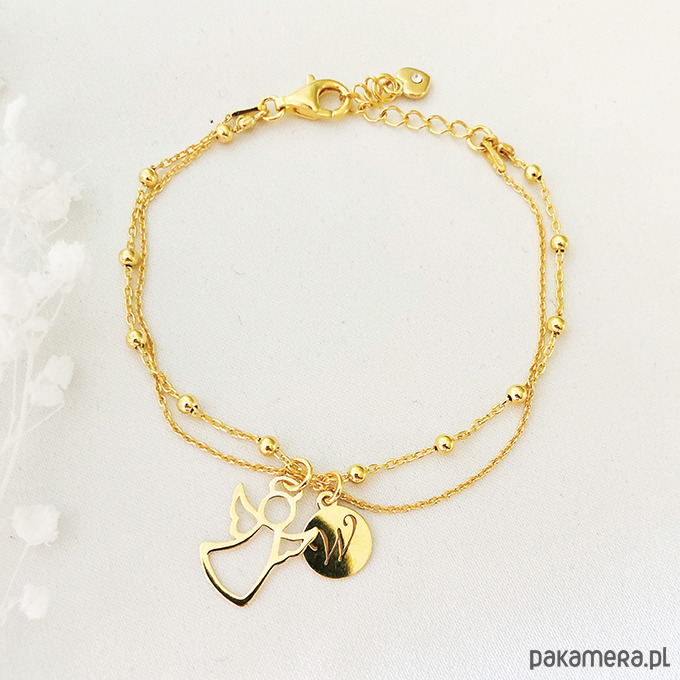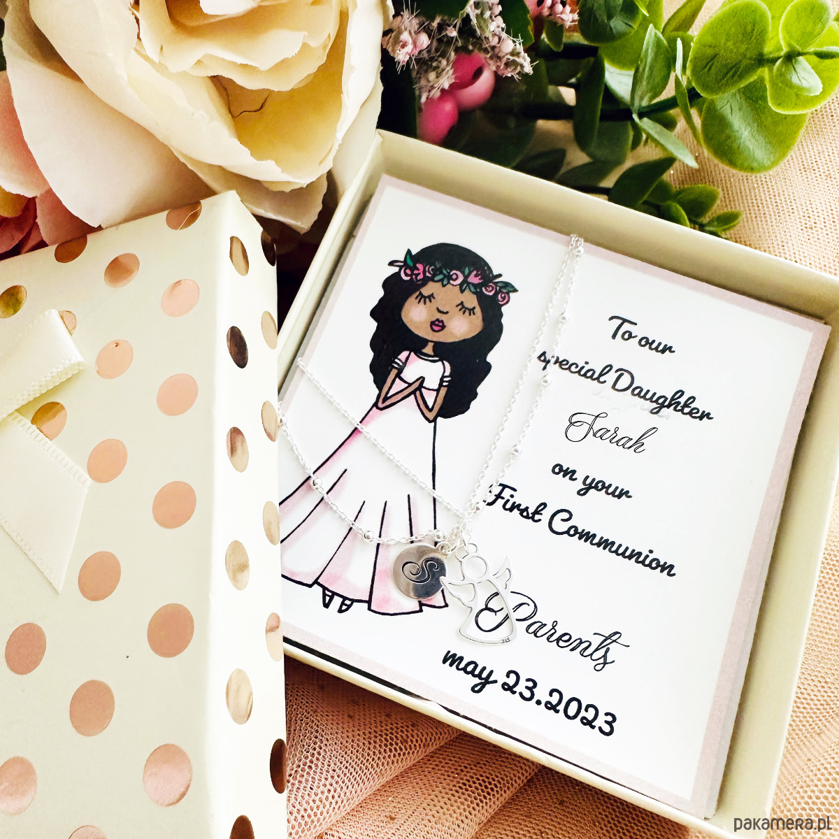 Personalizowany wyjątkowy prezent z okazji Pierwszej Komunii, zawiera piękną ponadczasową bransoletkę na podwójnym łańcuszku wykonaną ze srebra 925 z grawerowaną zawieszką inicjałem oraz aniołkiem i z kryształkiem Swarovski i z wykonaną ręcznie kartą z życzeniami).
