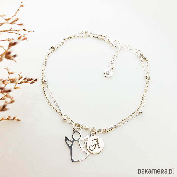 Personalizowany wyjątkowy prezent z okazji Pierwszej Komunii, zawiera piękną ponadczasową bransoletkę na podwójnym łańcuszku wykonaną ze srebra 925 z grawerowaną zawieszką inicjałem oraz aniołkiem( opcjonalnie z kryształkiem Swarovski i z wykonaną ręcznie kartą z życzeniami).