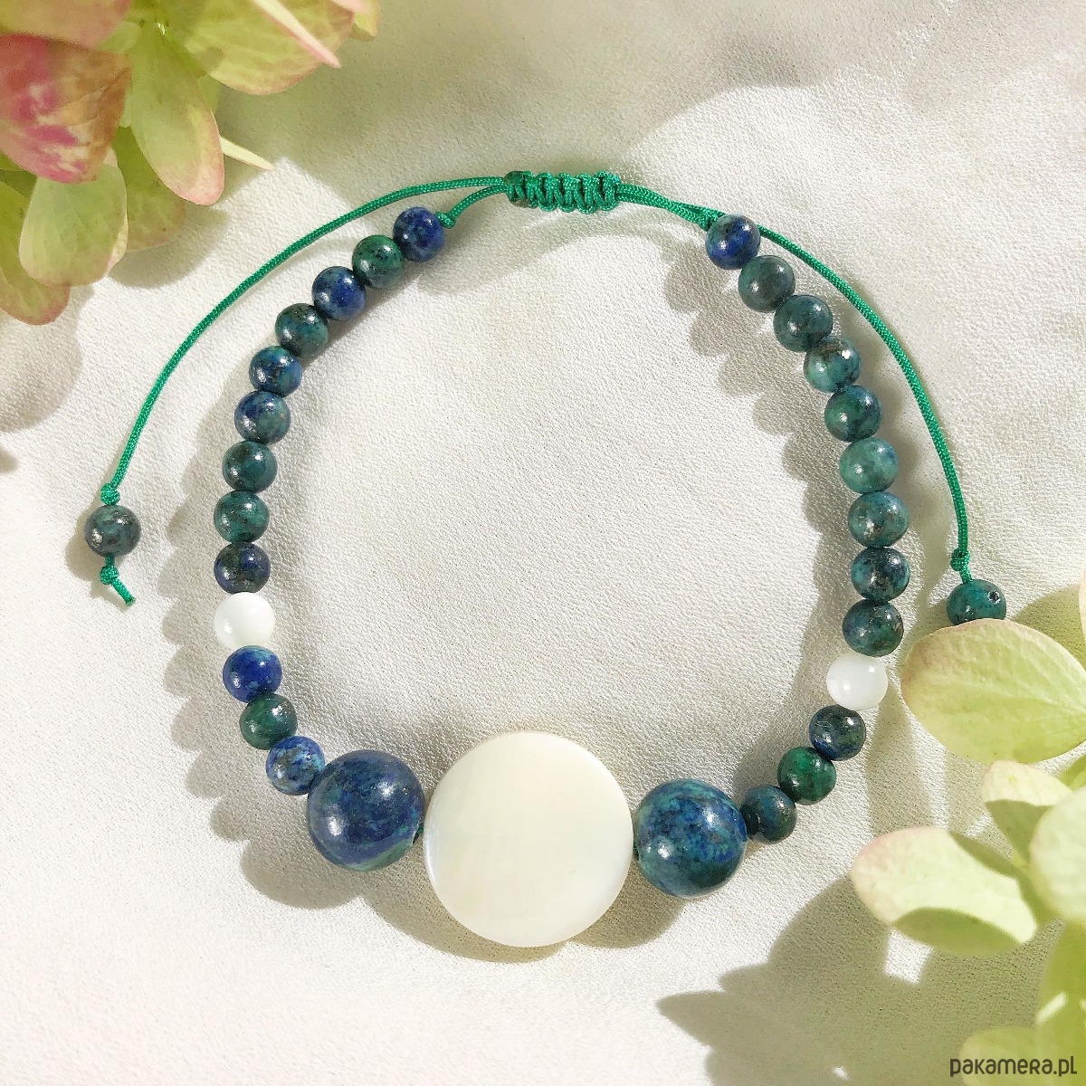 Zdobią ją kamienie naturalne : zielono granatowe azuryty w rozmiarze 8 i 4 mm i kuleczki z masy perłowej 4 mm. Zwieńczenie bransoletki stanowi krążek z masy perłowej 15 mm.