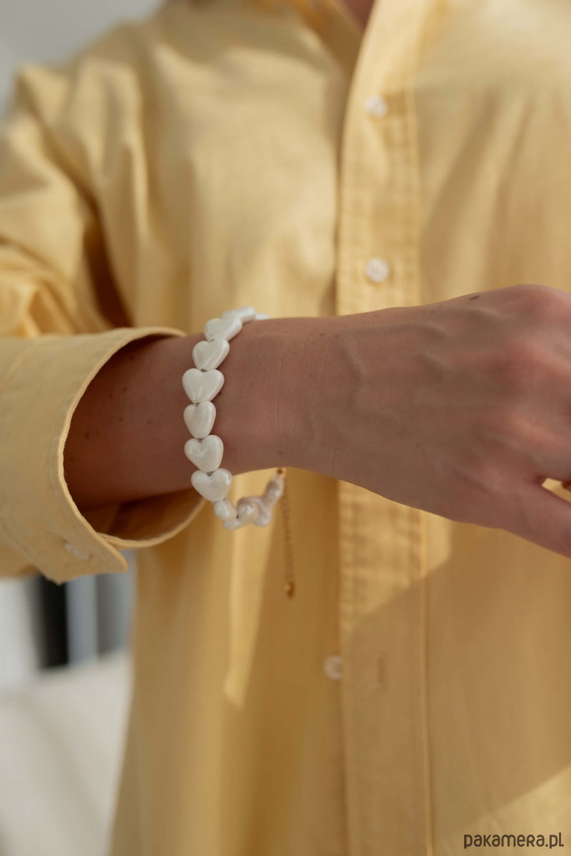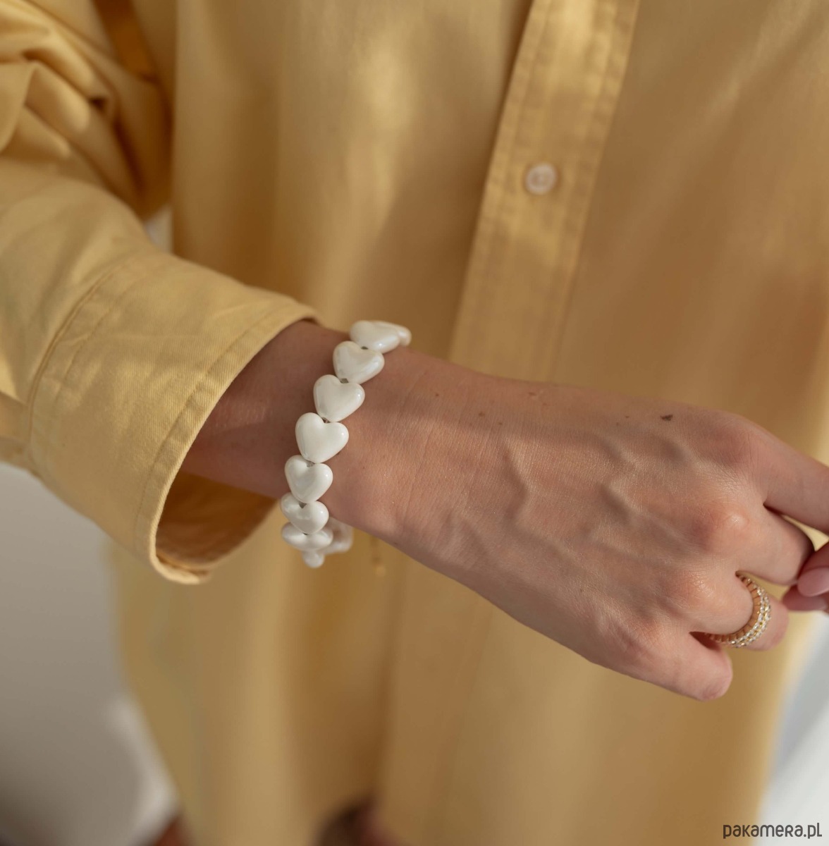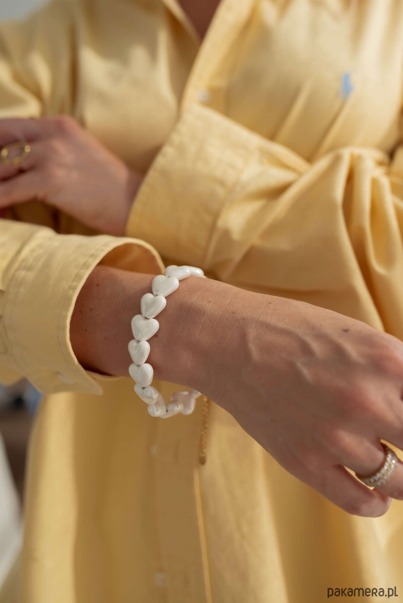 To bransoletka, która świetnie sprawdzi się jako prezent - symbol miłości i piękna w minimalistycznej formie. Materiał: ceramiczne elementy w kształcie serduszek, stal chirurgiczna pozłacana Długość: 21 cm + 5 cm przedłużenia Znaczenie: serce - symbol miłości, bliskości i kobiecej delikatności