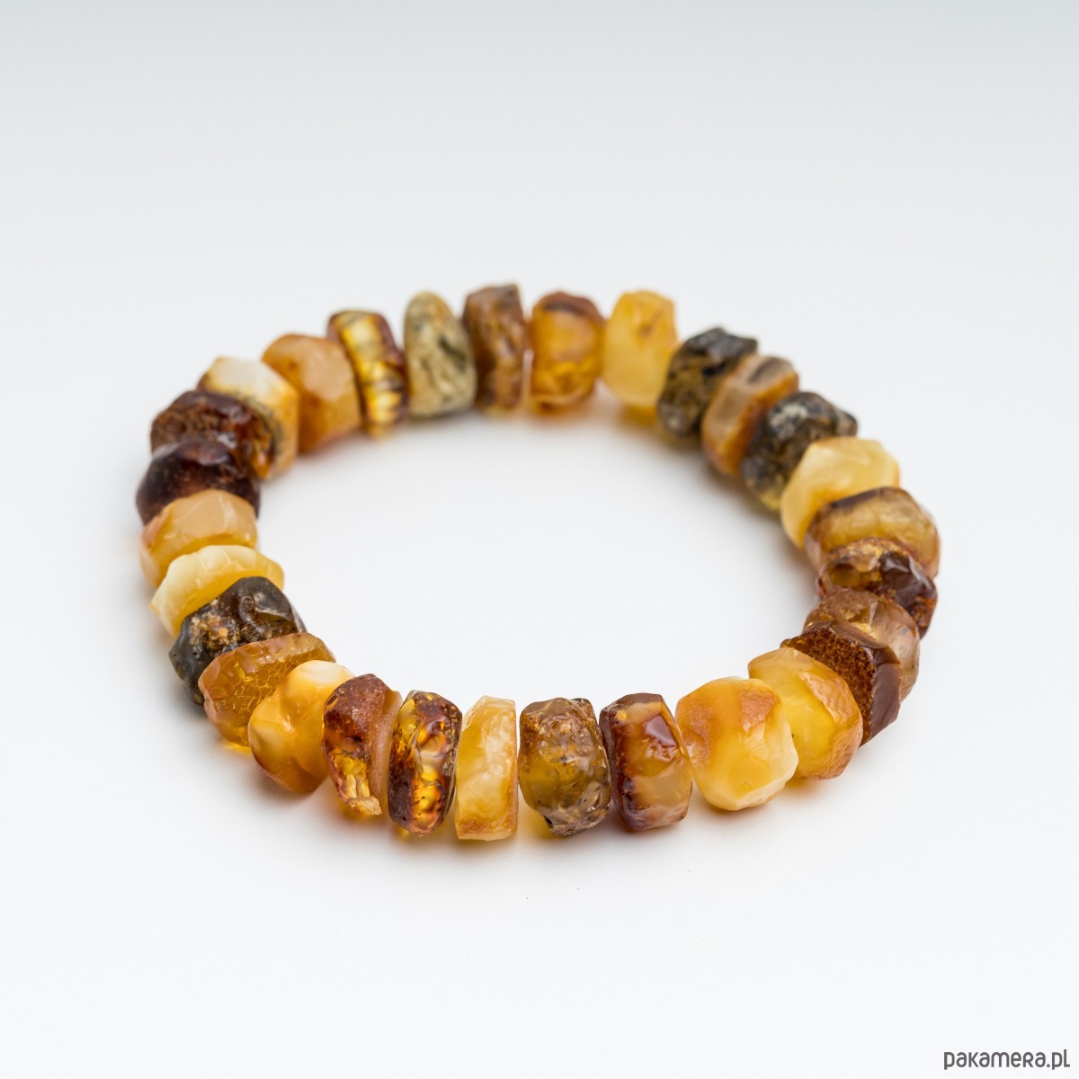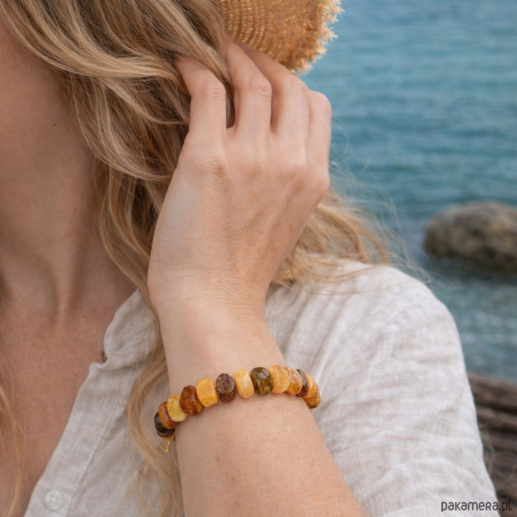 Ta ręcznie wykonana bransoletka została stworzona z naturalnych dysków bursztynu bałtyckiego w odcieniach miodowym, żółtym, koniakowym i czarnym. Wszystkie matowe, bursztynowe talarki zostały nawleczone na elastyczną, wytrzymałą gumkę, która dopasowuje się do każdego nadgarstka. Eleganckie połączenie komfortu i naturalnej elegancji bursztynu!