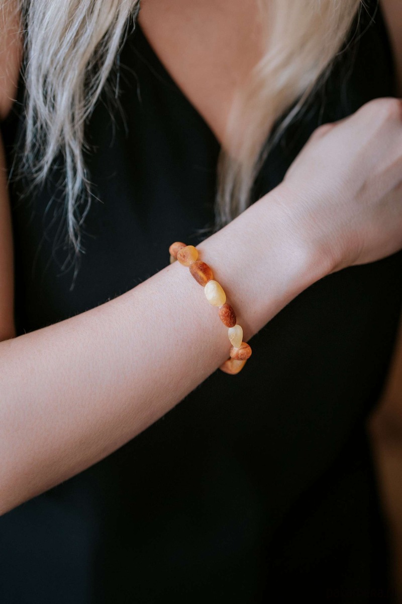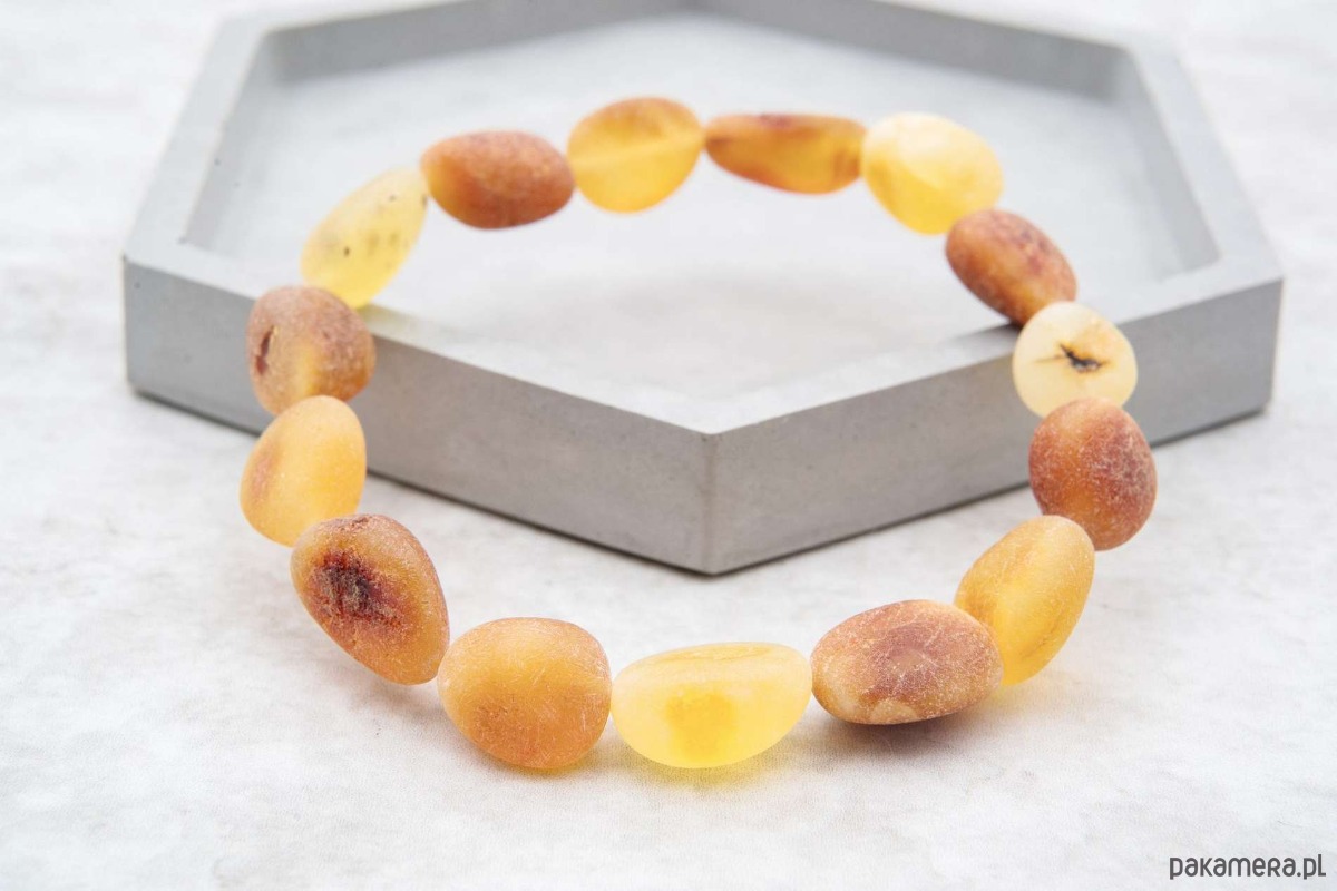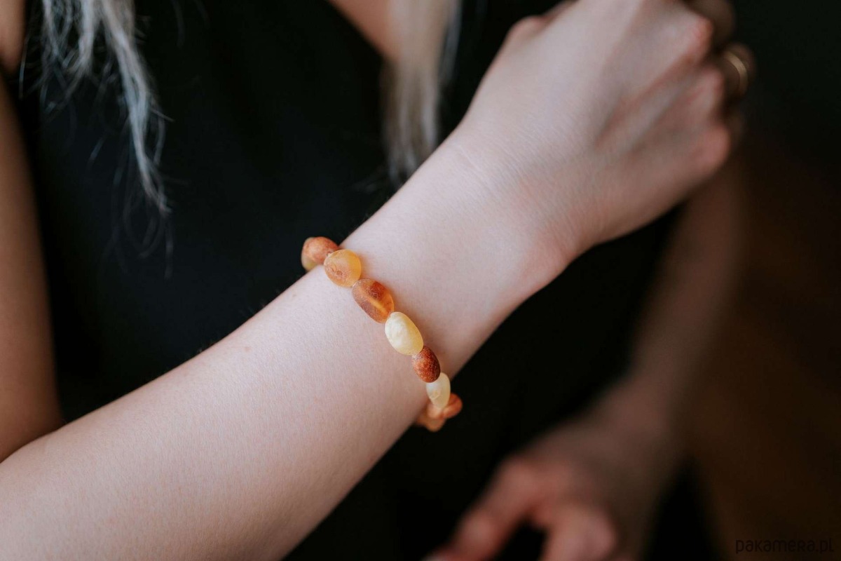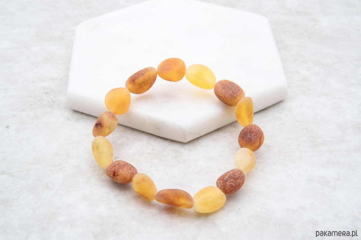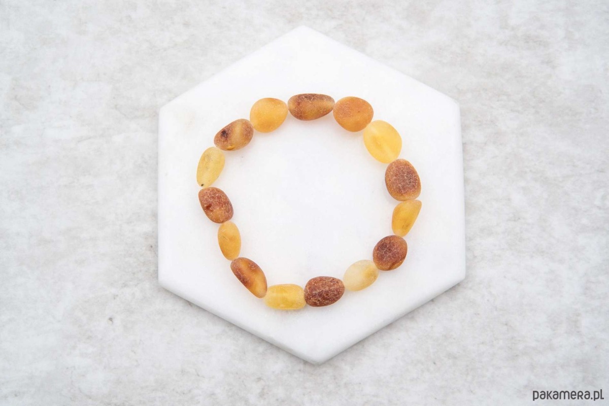 Ta ręcznie wykonana bransoletka stworzona została z naturalnych koralików z bursztynu bałtyckiego w ciepłych odcieniach koniaku i miodu. Surowe, niepolerowane, oliwkowate koraliki zostały nawleczone na wytrzymałą gumkę, która dopasowuje się do każdego nadgarstka. Eleganckie połączenie wygody i naturalnej elegancji bursztynu!