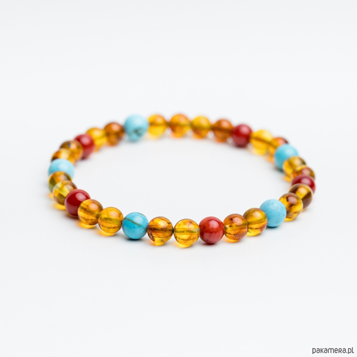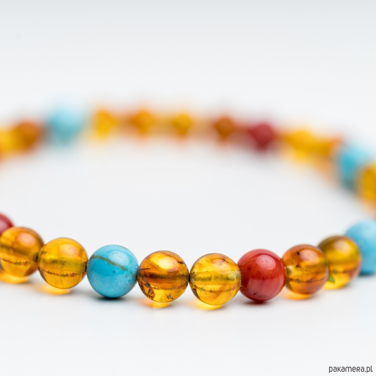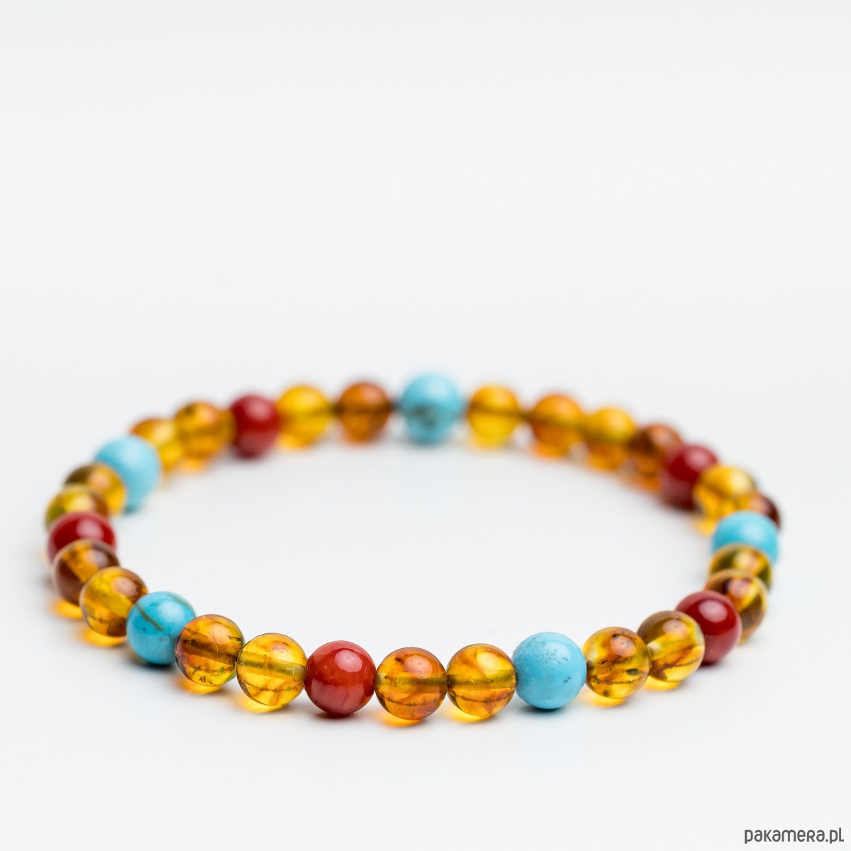 Elegancka bransoletka wykonana z naturalnego bursztynu bałtyckiego, turkusu oraz korala o regularnym kształcie kulki 6 mm. Klasyczny koniakowy odcień bursztynu pięknie mieni się w świetle, podkreślając naturalne inkluzje i wyjątkowy charakter każdego koralika.