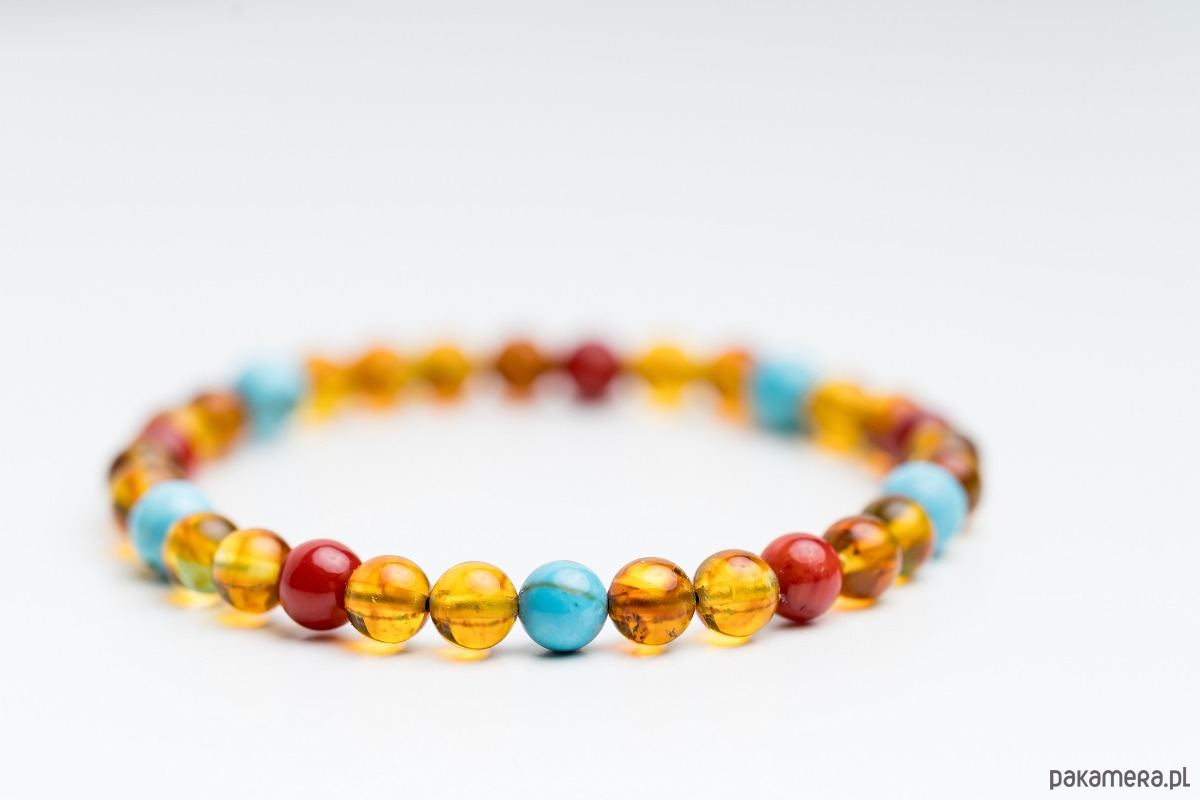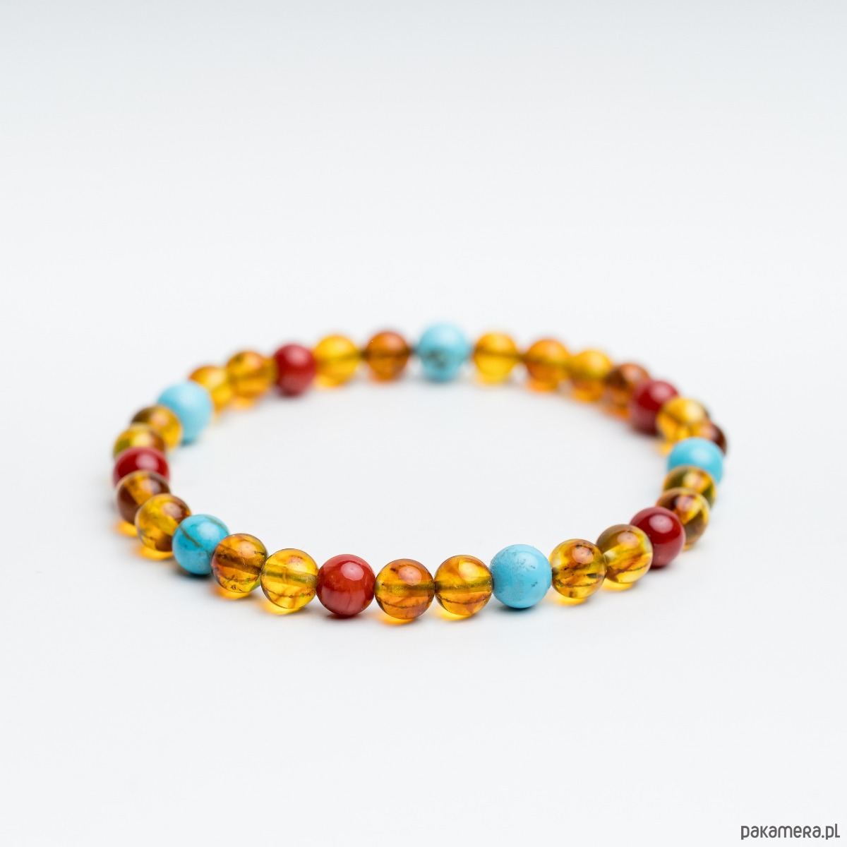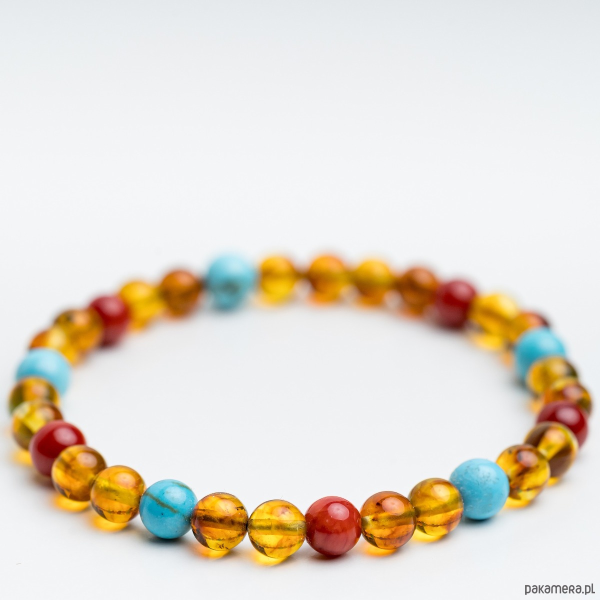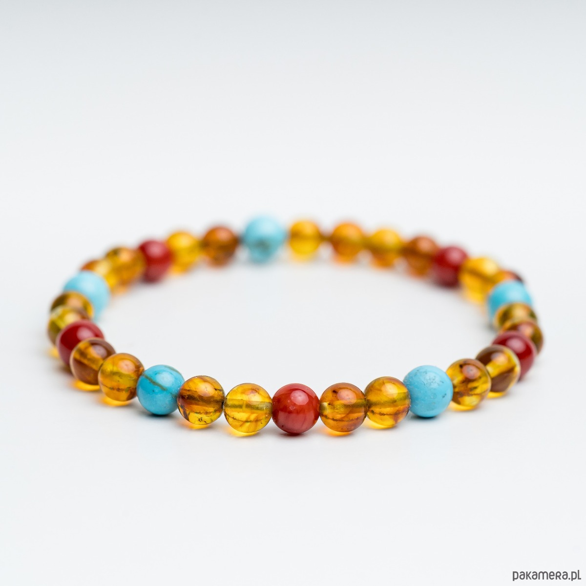 Elegancka bransoletka wykonana z naturalnego bursztynu bałtyckiego, turkusu oraz korala o regularnym kształcie kulki 6 mm. Klasyczny koniakowy odcień bursztynu pięknie mieni się w świetle, podkreślając naturalne inkluzje i wyjątkowy charakter każdego koralika.