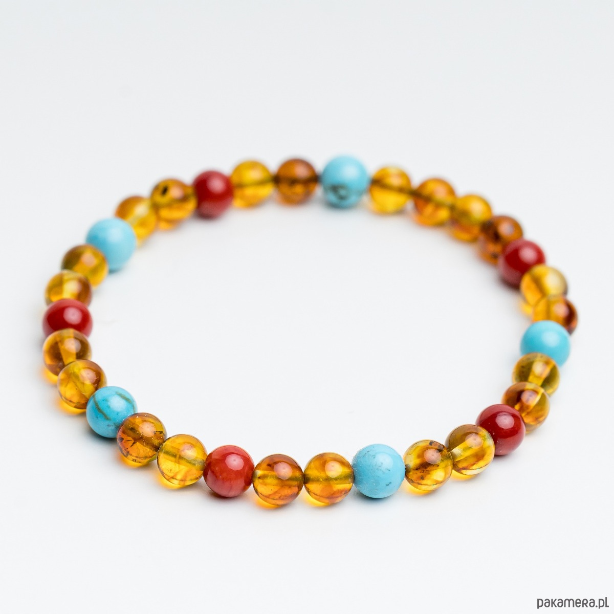 Bransoletka z bursztynu bałtyckiego, turkusu, oraz korala – kulka 6 mm, 20 cm