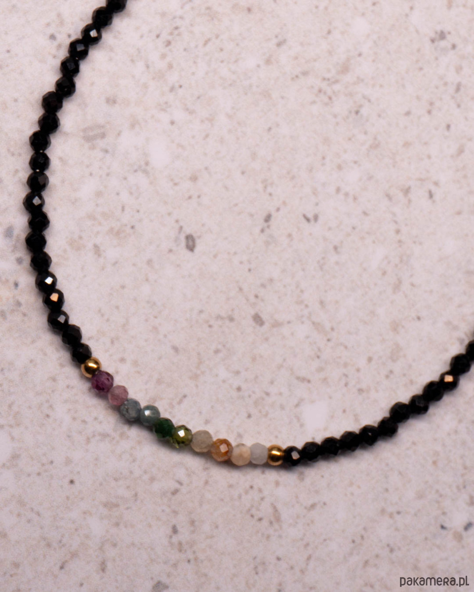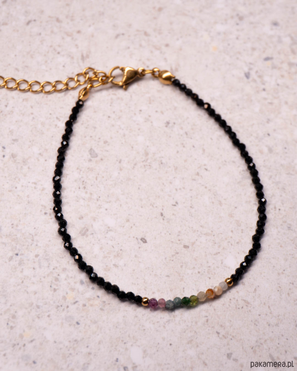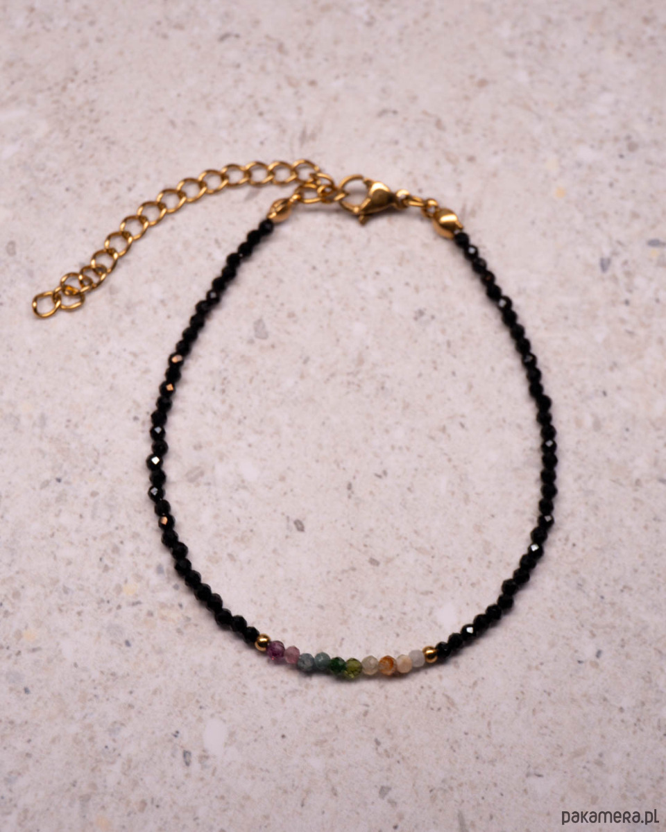Czarny turmalin z dodatkiem turmalinu kolorowego. Bardzo delikatna bransoletka z malutkich kamyczków.