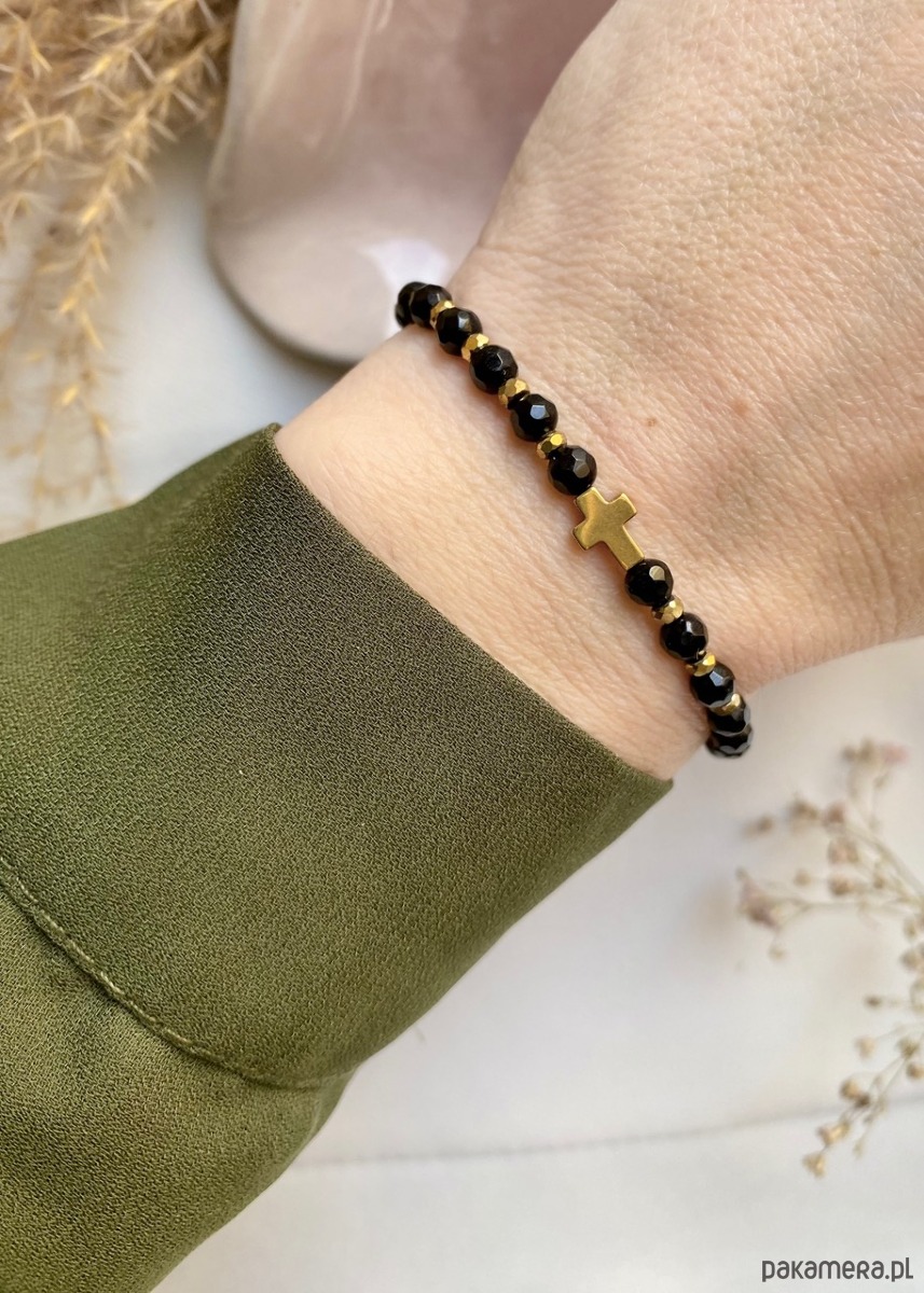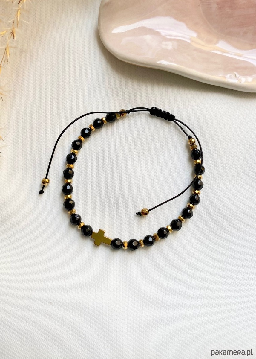 Bransoletka z czarnym turmalinem i złotym krzyżykiem