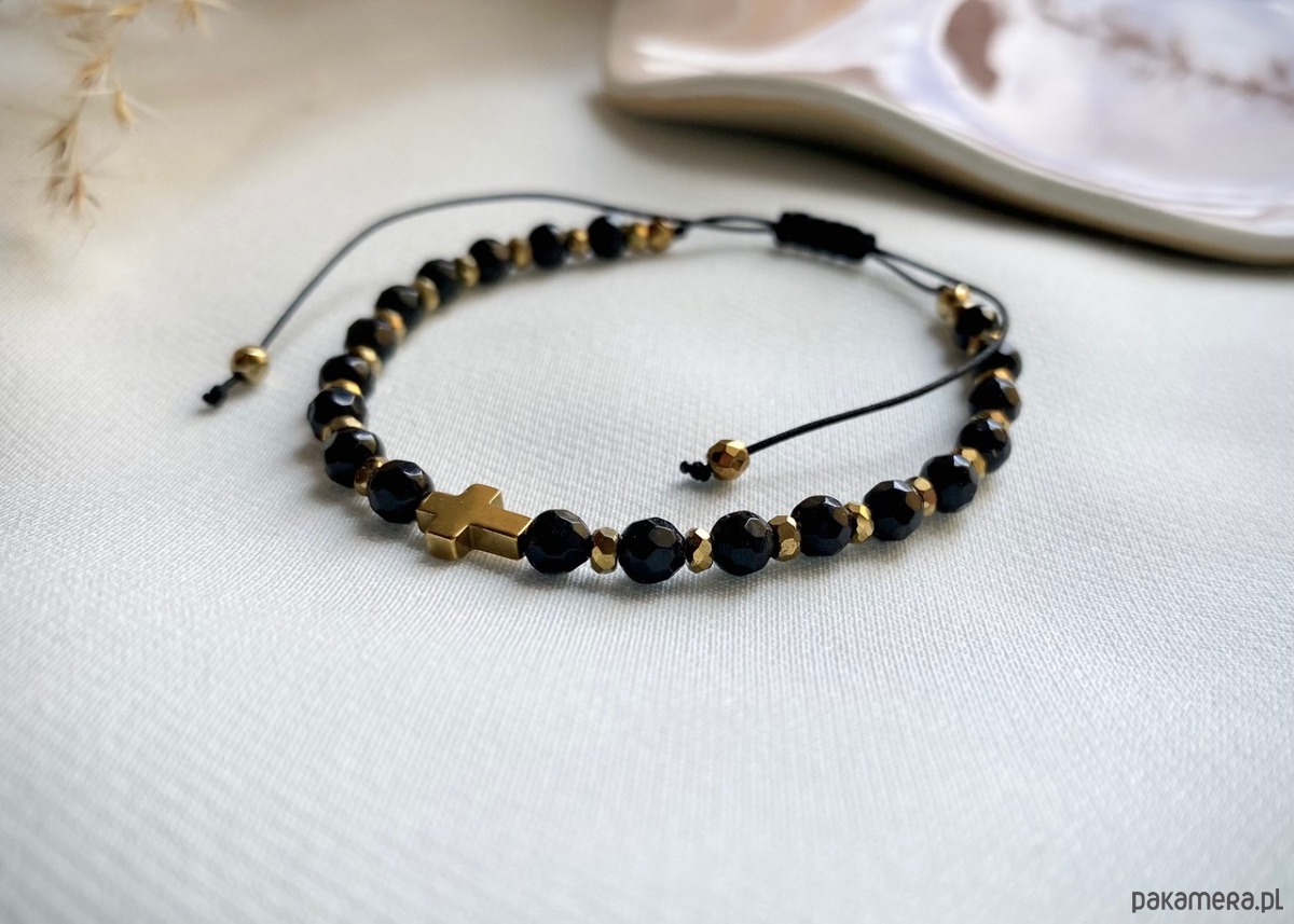 Bransoletka z czarnym turmalinem i złotym krzyżykiem z hematytu – stylowy talizman ochronny