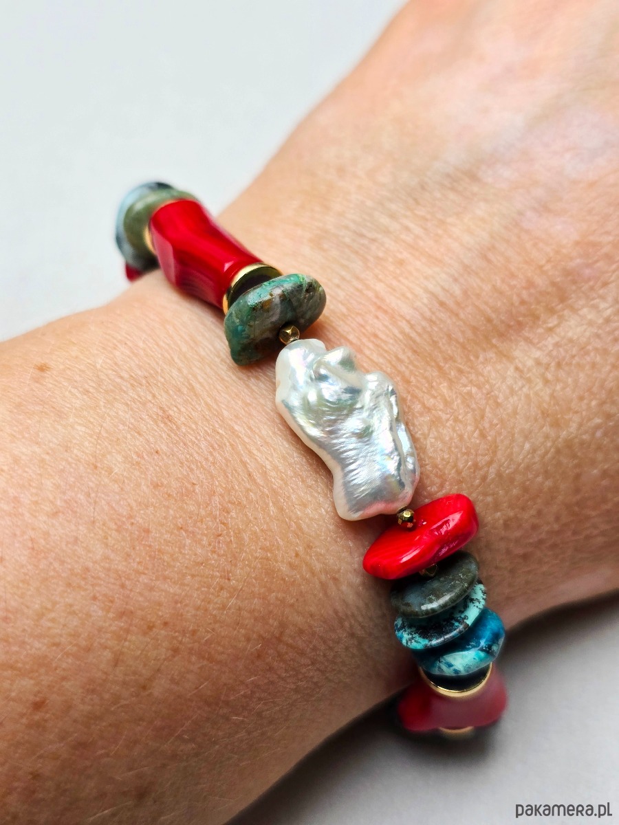 Wykorzystane kamienie: koral czerwony, chryzokola, złocony hematyt