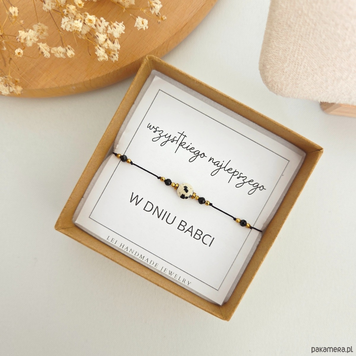 Bransoletka jest sprzedawana z piękną dedykacją na Dzień Babci, z opcją personalizacji tekstu, dzięki czemu stanowi wyjątkowy, spersonalizowany prezent pełen ciepła i miłości.