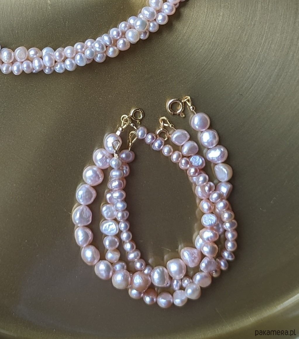 Wyjątkowo lśniące, różowe perełki, które pięknie ozdobią nadgarstek. Szczególnie atrakcyjnie wyglądają na opalonej skórze. Bransoletka wykonana jest z delikatnych perełek o nieregularnym kształcie. Perły są drobne, różowawe,bardzo błyszczące. Ładnie komponują się z innymi bransoletkami. Wykończenie z pozłacanego srebra, wysłany egzemplarz będzie z przedłużką.