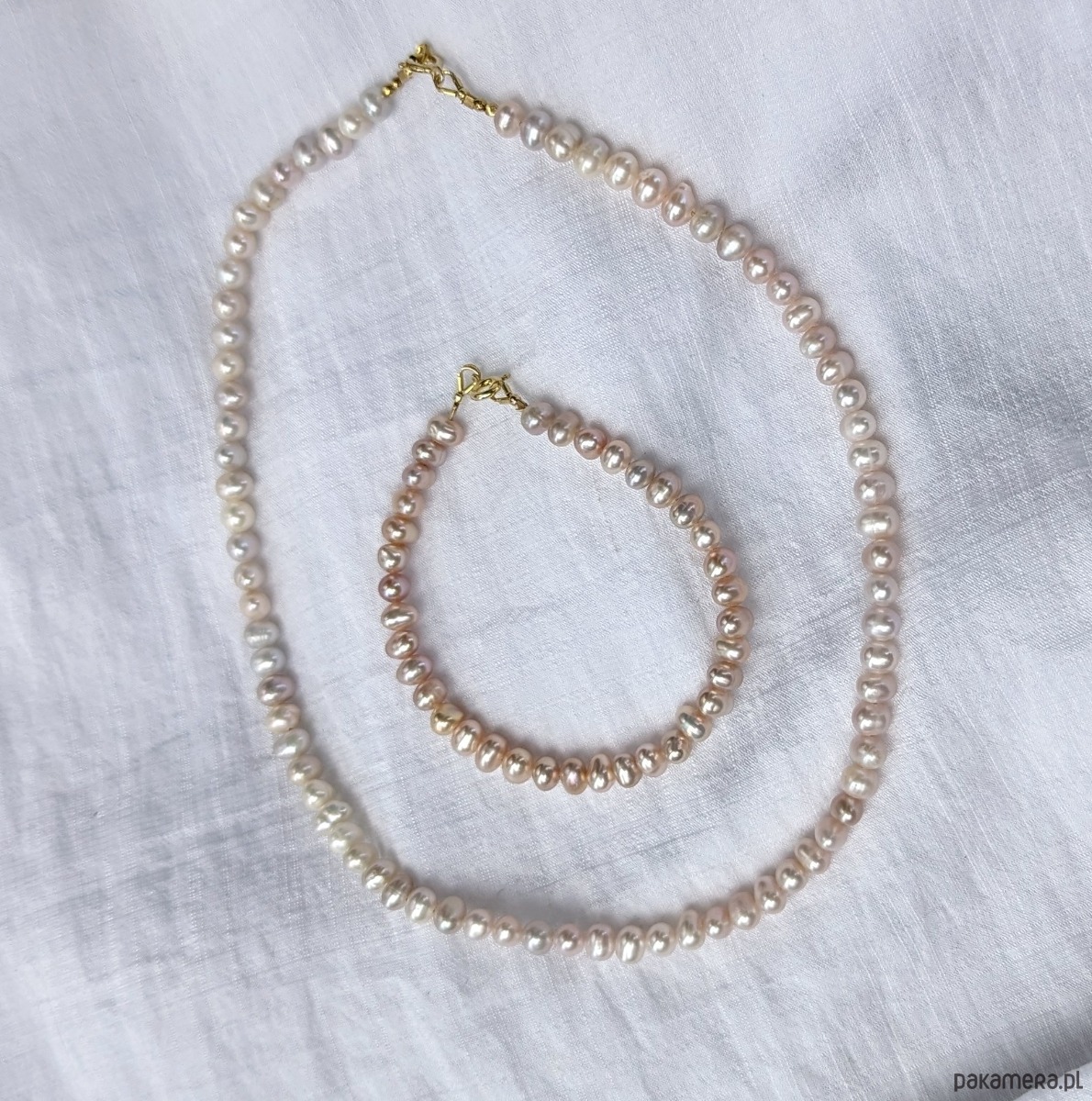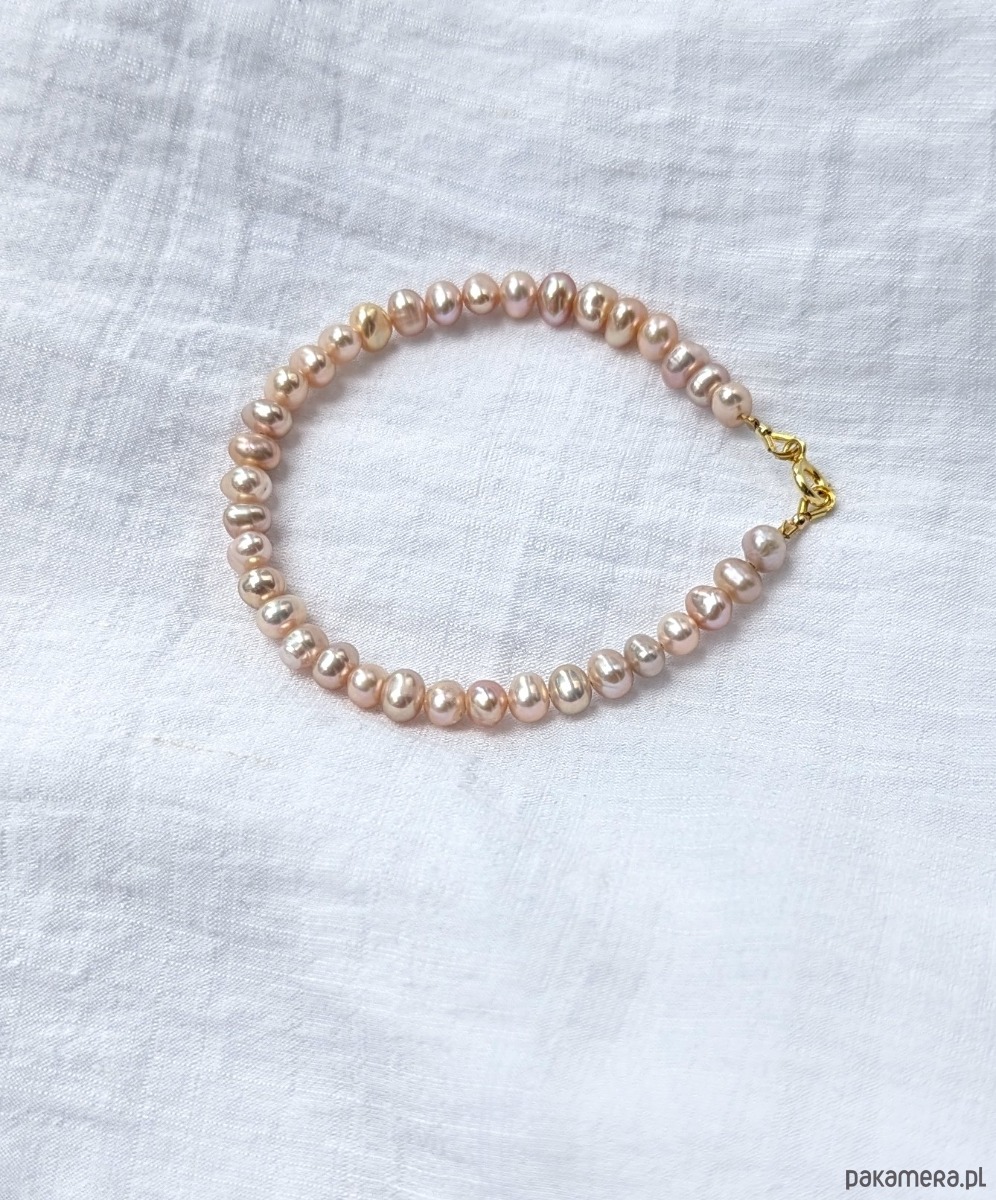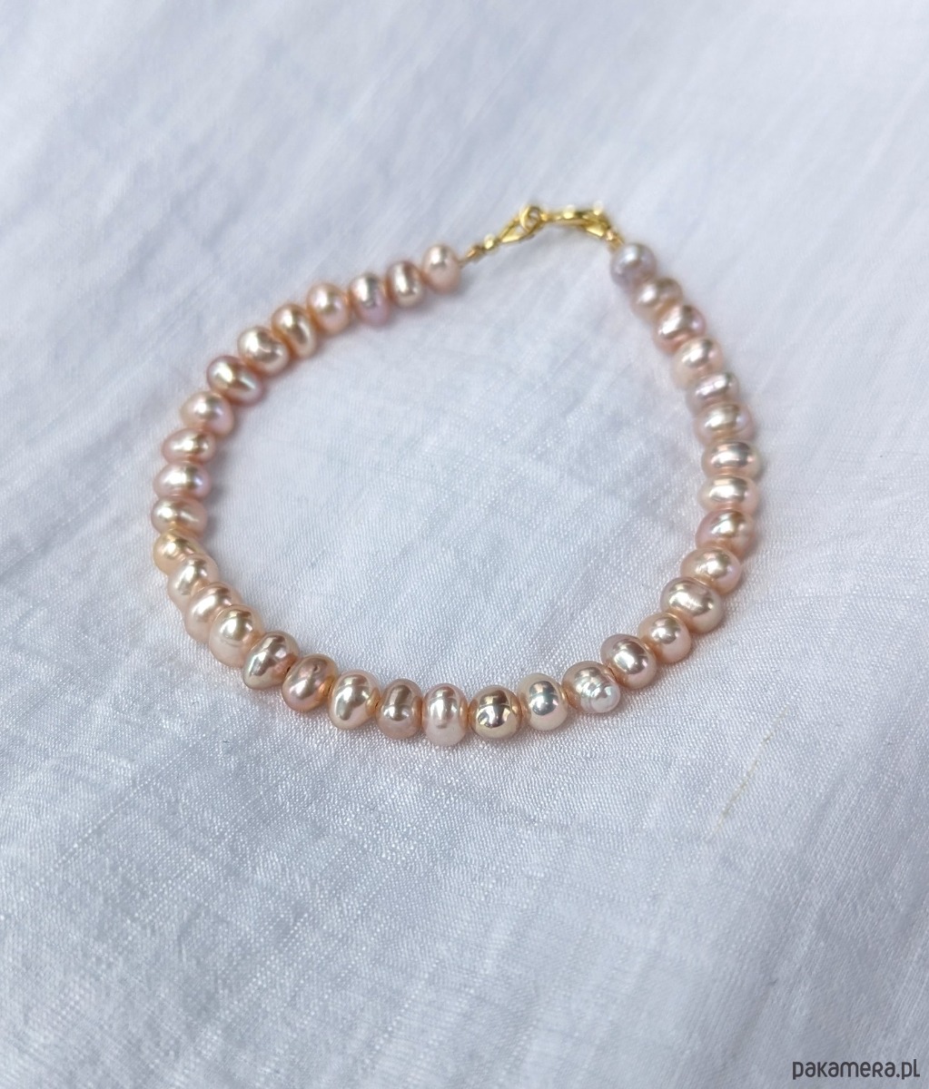 Wyjątkowo lśniące, różowe perełki, które pięknie ozdobią nadgarstek. Szczególnie atrakcyjnie wyglądają na opalonej skórze. Bransoletka wykonana jest z delikatnych perełek o nieregularnym kształcie. Perły są drobne, różowawe,bardzo błyszczące. Ładnie komponują się z innymi bransoletkami. Wykończenie z pozłacanego srebra, wysłany egzemplarz będzie z przedłużką.