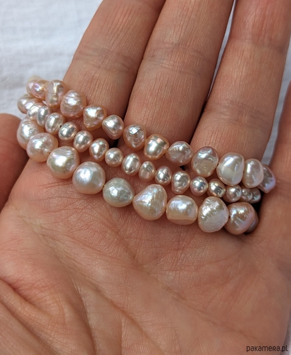Perły słodkowodne - prawdziwe, hodowlane, nieregularne, w odcieniach różu, gładkie i lśniące, długość 5-6 mm