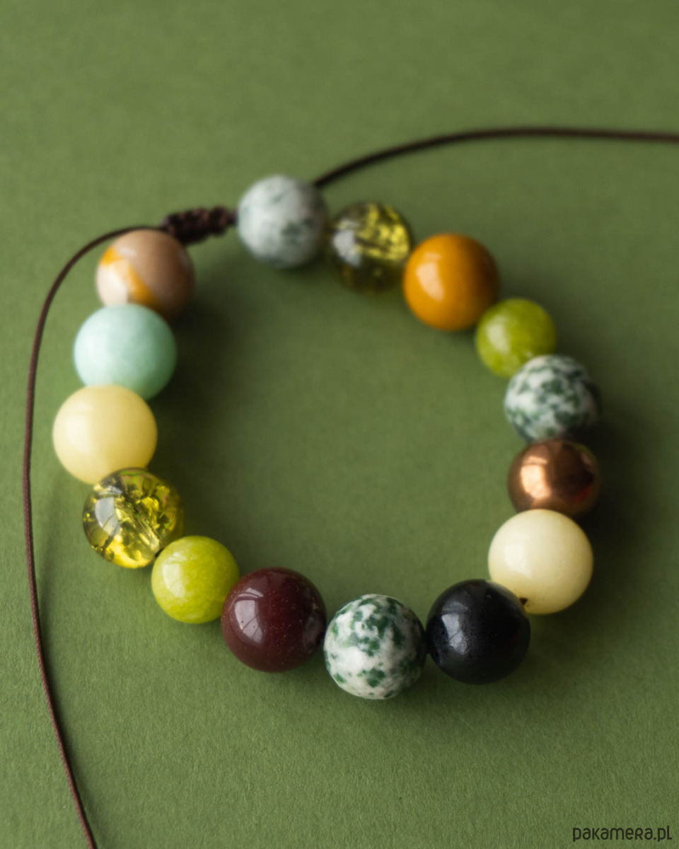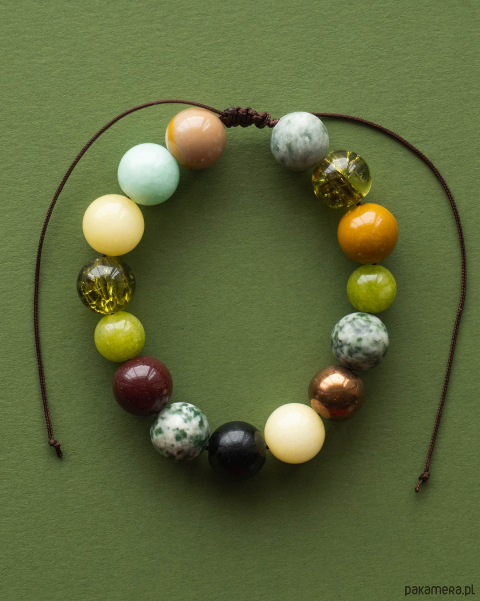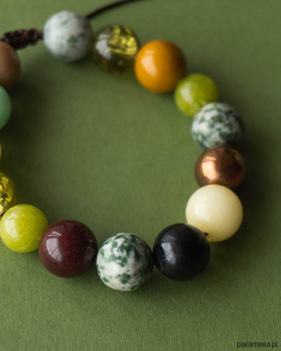 Bransoletka z pięknych dużych kamieni w jesiennych kolorach: mokait, jaspis zielony, jadeit, marmur, hematyt, szkło.