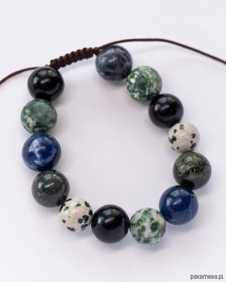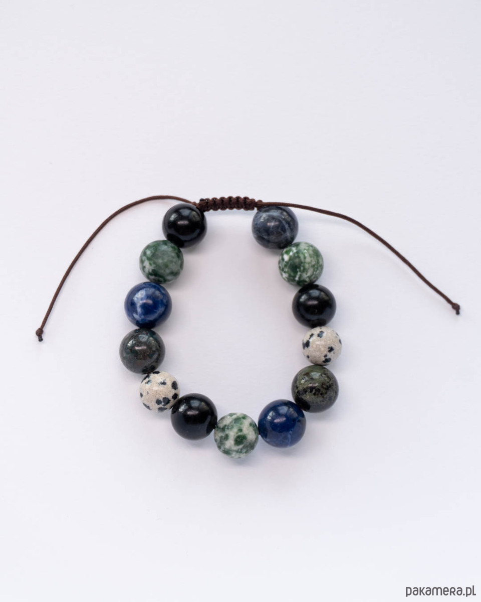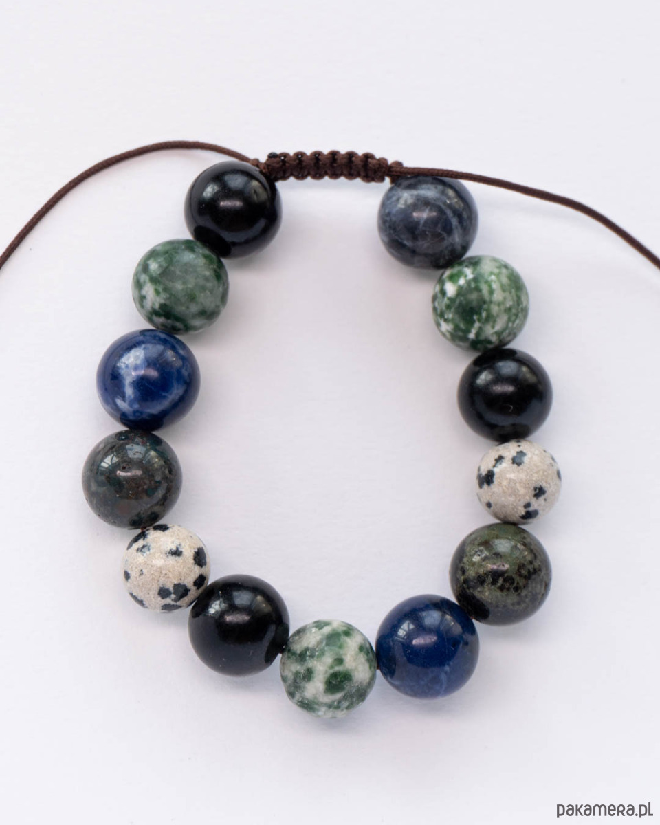 Bransoletka z pięknych dużych kamieni w pięknych kolorach: sodalit, jaspis dalmatyński, jaspis zielony, agat, marmur.